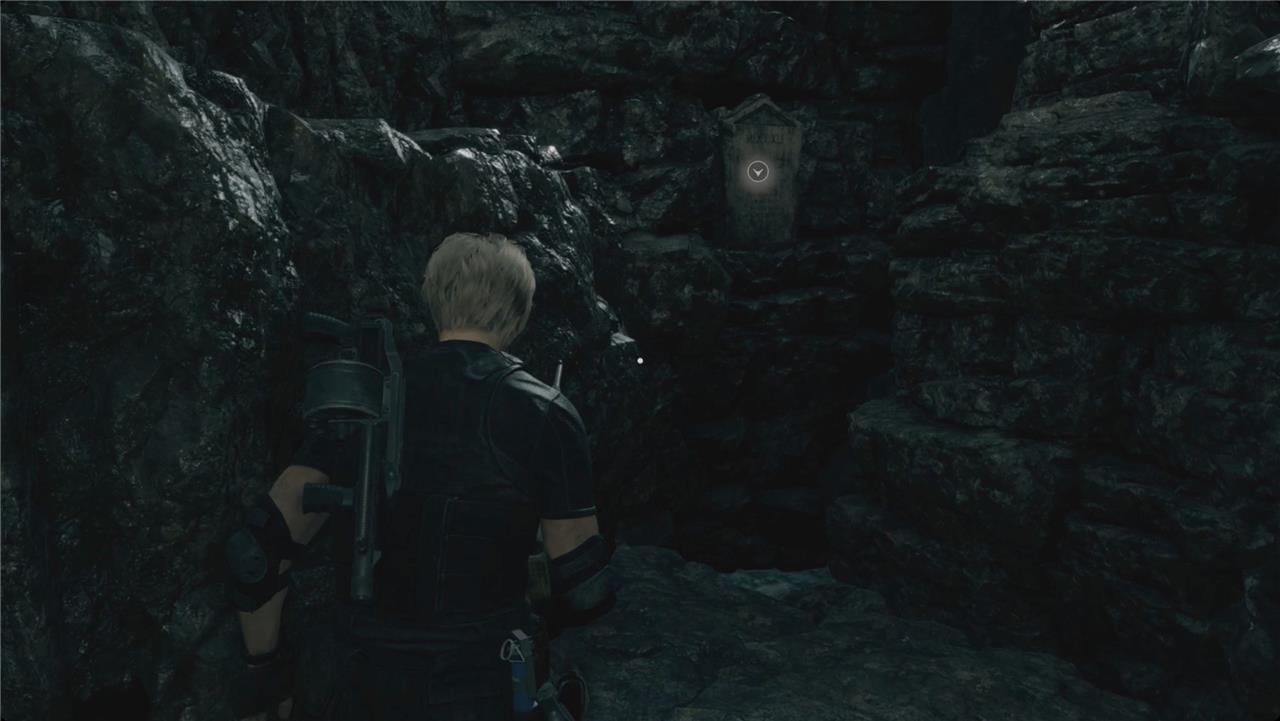 Since you can’t do anything about it, keep to the right. Cross the bridge and take the first right. At the end of the path, look at the headstone to get the Eroded Cave Epitaph file. Climb the rocks on your left to find two crates with pesetas, a heavy grenade, and handgun ammo.