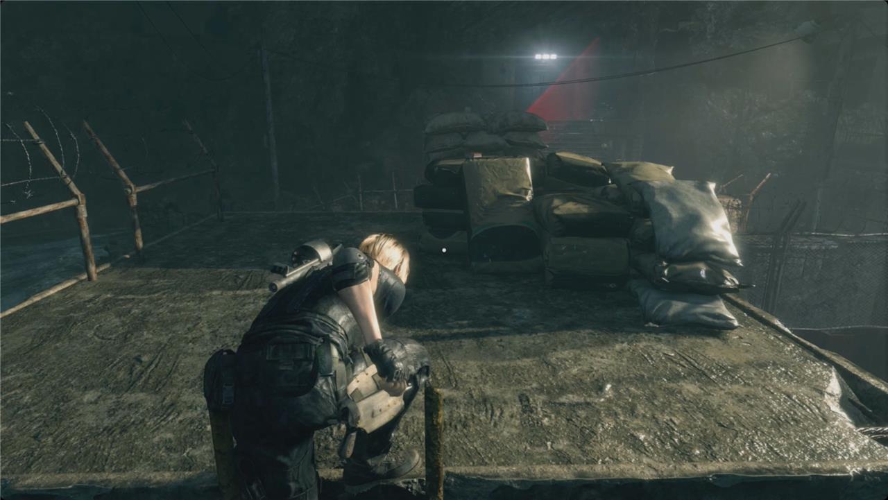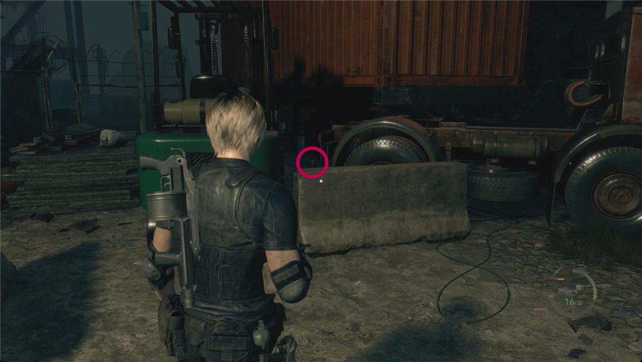 Redirect the auto-turret on the roof with you. Look above it to see the pair of spotlights on the roof of the building across from you. Shoot them – make sure you hit the face and not the casing – to save yourself some trouble later. Drop off the roof and cross the street to grab the red herb there. Vault the window on your right and smash the crate inside for some rifle ammo. Outside, there’s another barrel in the middle of the Wharf on a raised platform with more handgun ammo.