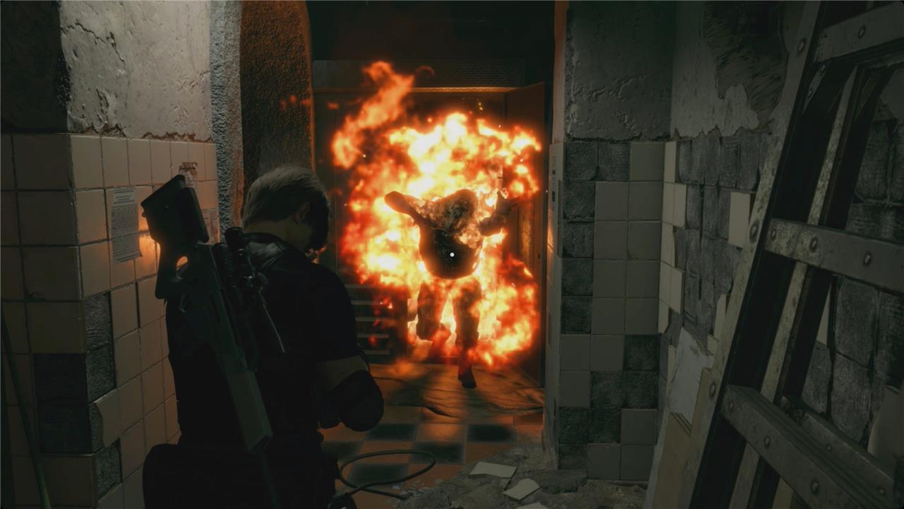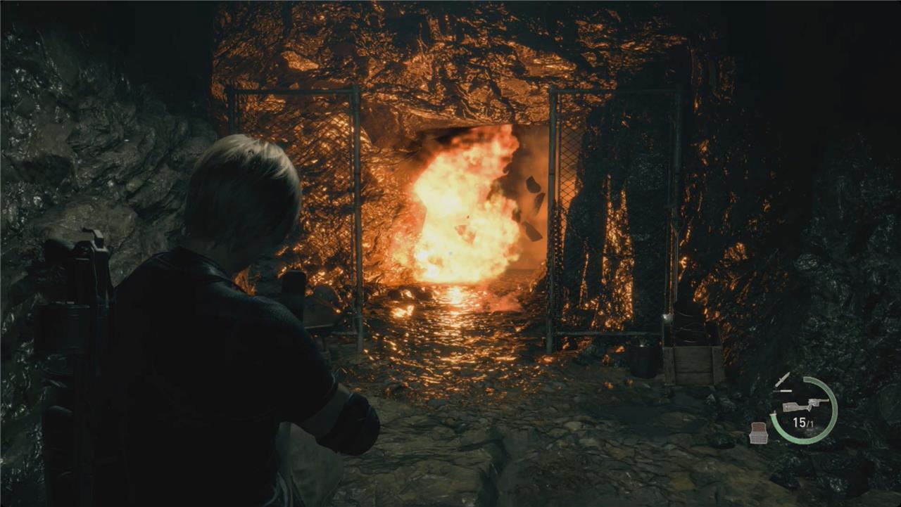 After entering the holding cell area, grab the key from the nearby table to unlock Ashley’s cage and free her from the Ganados’ grasp. A short cutscene plays as she reunites with Leon, then quickly move to the exit while fending off pursuing enemies with shotgun blasts or grenades to thin their ranks. Watch for the Iron Maiden emerging from the shadows-aim for its single eye with a rifle or magnum to stagger and destroy it fast. Once clear, proceed through the door to the next section, keeping Ashley safe amid the chaos.