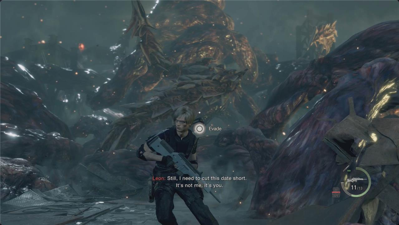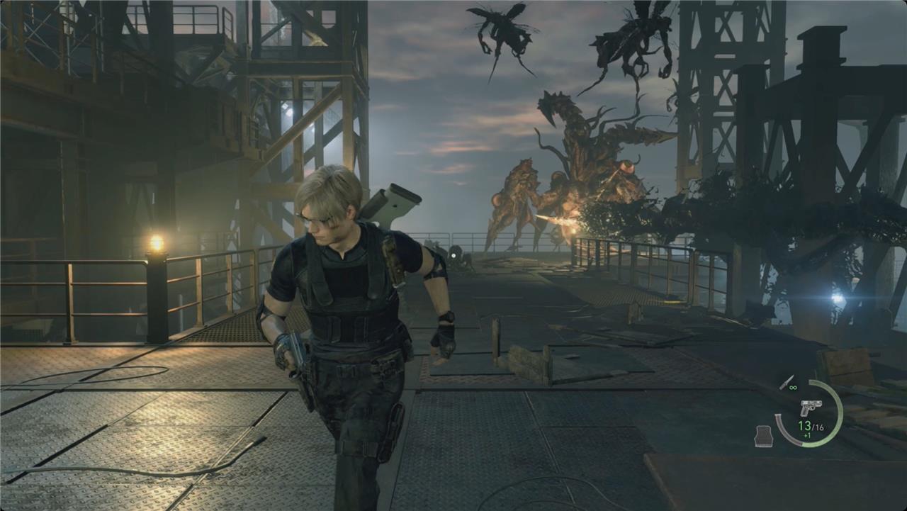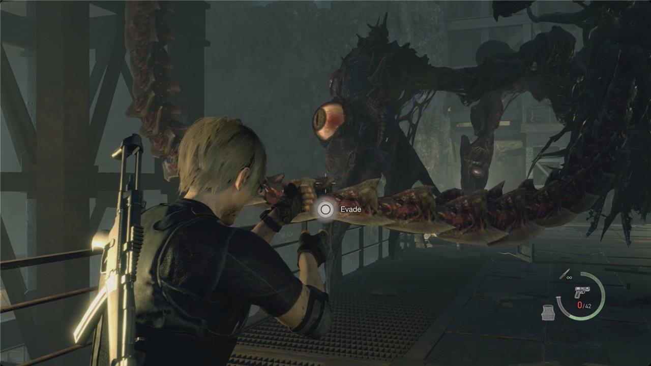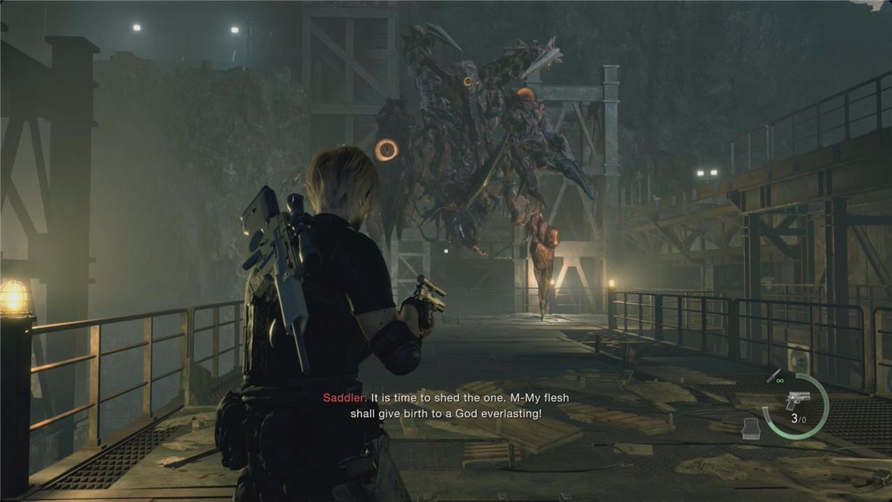The final battle against Osmund Saddler takes place on the metal platforms of the loading docks, where Leon must face the mutated cult leader in his most monstrous form. Use the environment to your advantage-grenades, rockets, and explosive barrels can deal heavy damage to his exposed eyes. Keep moving to avoid his sweeping tentacle strikes and projectile attacks. When Saddler staggers, get close to stab the eye on his body for massive damage. Once weakened, use Ada’s special rocket launcher to finish the fight and clear the path to the escape route.