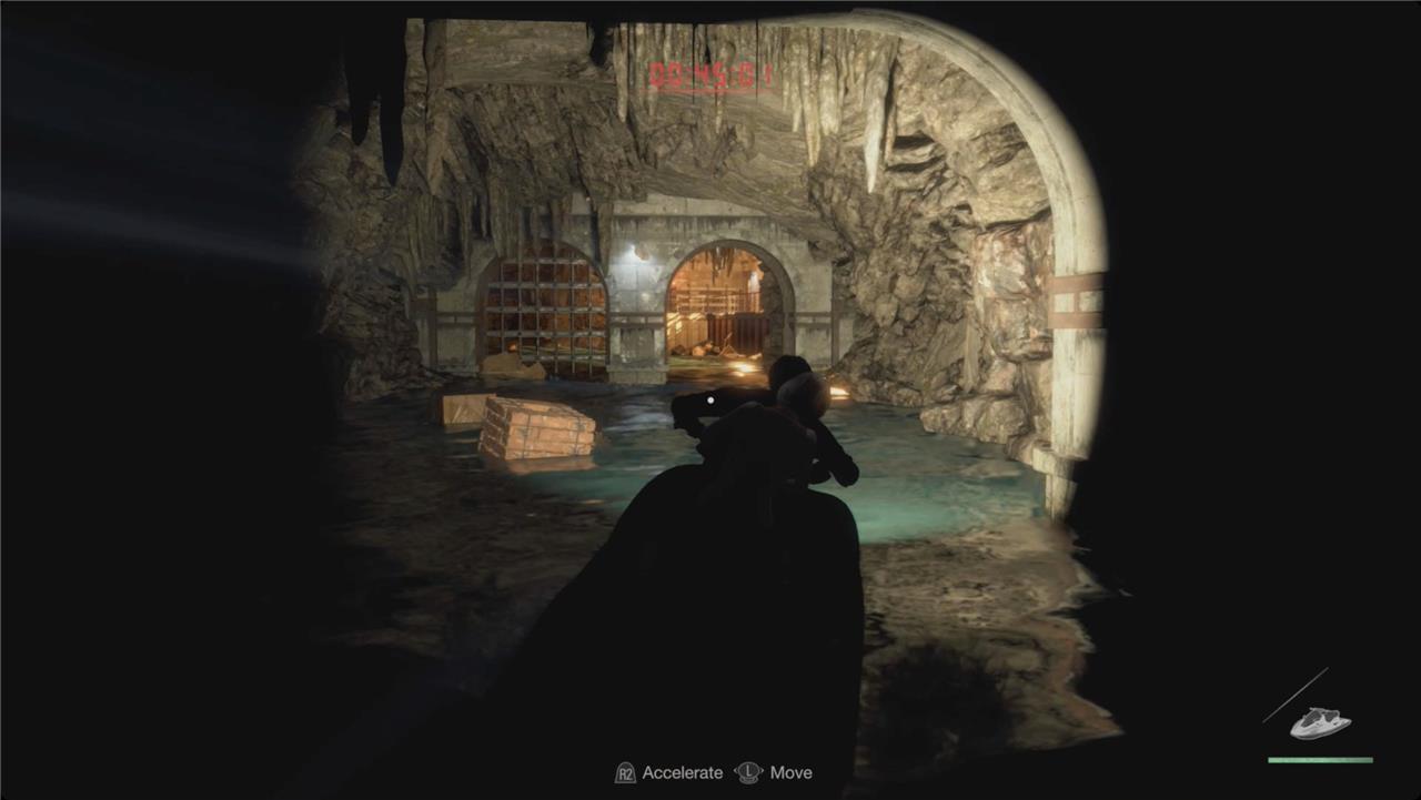 The next section is Leon and Ashley’s water stunt spectacular with a lot of boating very fast through collapsing tunnels. There’s not a lot of subtlety here – accelerate with R2 on the straightaways and let go during the turn-y bits.