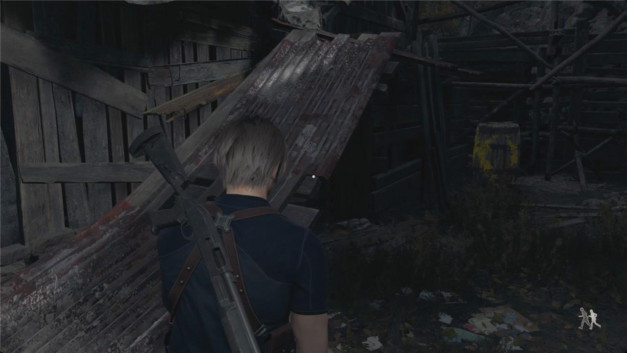 Back on the ground, check the shack on the left for some barrels and crates with pesetas and a blue velvet. On the right, grab the resources (L) and smash the crate for gunpowder. A little farther down, there’s another shack on the left with a hand grenade and barrels holding pesetas and gunpowder. Circle to the back of that shack for a barrel with pesetas and handgun ammo.