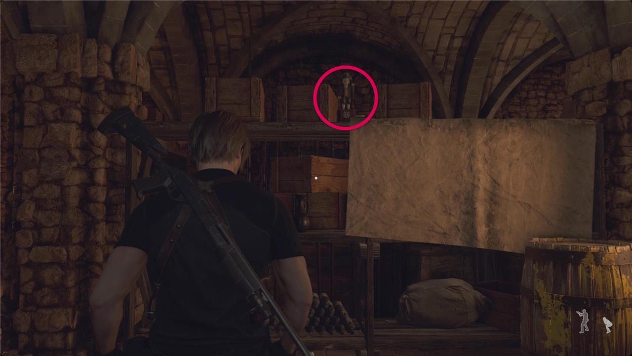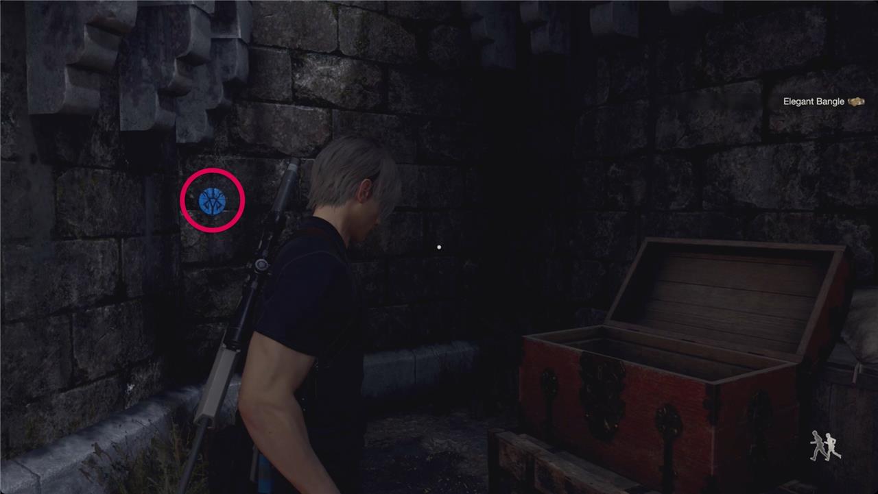 Smash the crate and barrel for rifle ammo and shotgun shells, and then turn right to drop off the ledge. Take a left and smash the barrels for pesetas and more rifle ammo. Open the chest for an Elegant Bangle, and then turn left to see Blue Medallion 4 of 6.