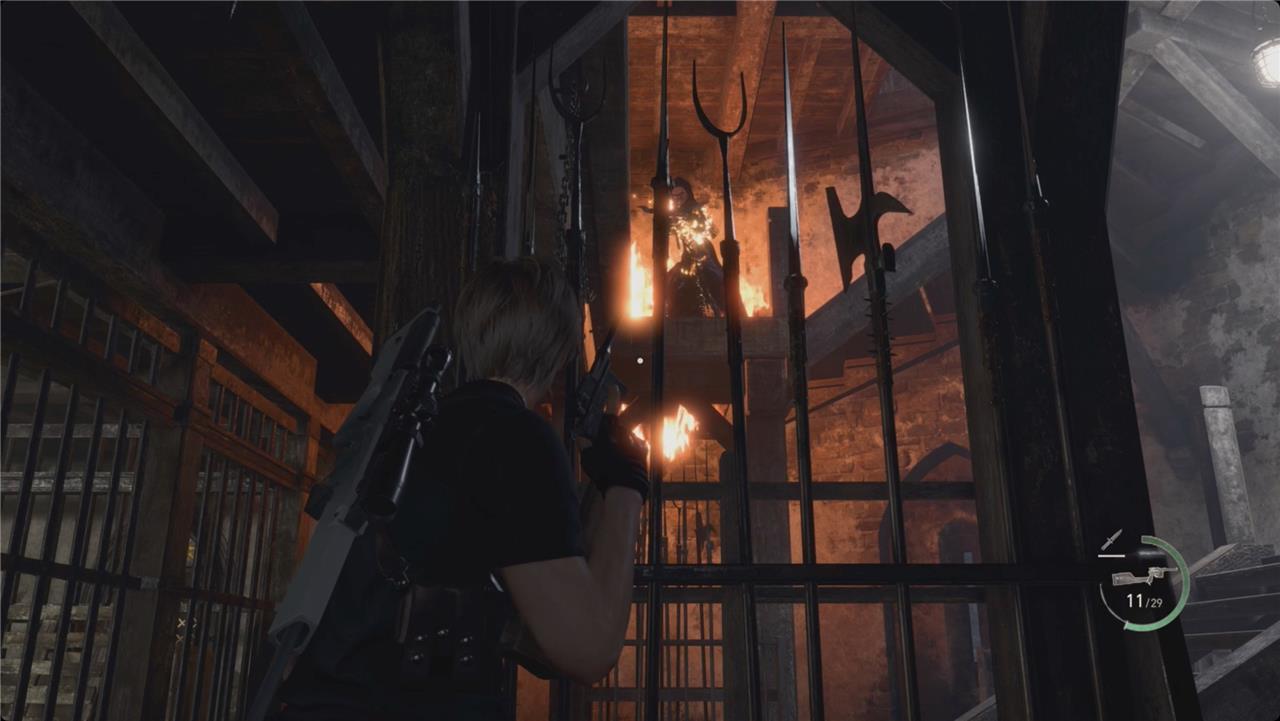 The Armored Giant bursts into the arena surrounded by flaming debris, forcing Leon to keep a safe distance while aiming for the exposed weak points revealed by the furnace’s heat. Use the environment to your advantage-trigger the trap mechanism when the creature stands over the center grate to send it into the molten pit below. Precision and patience are key here, as its armor deflects most direct shots until the right moment presents itself.