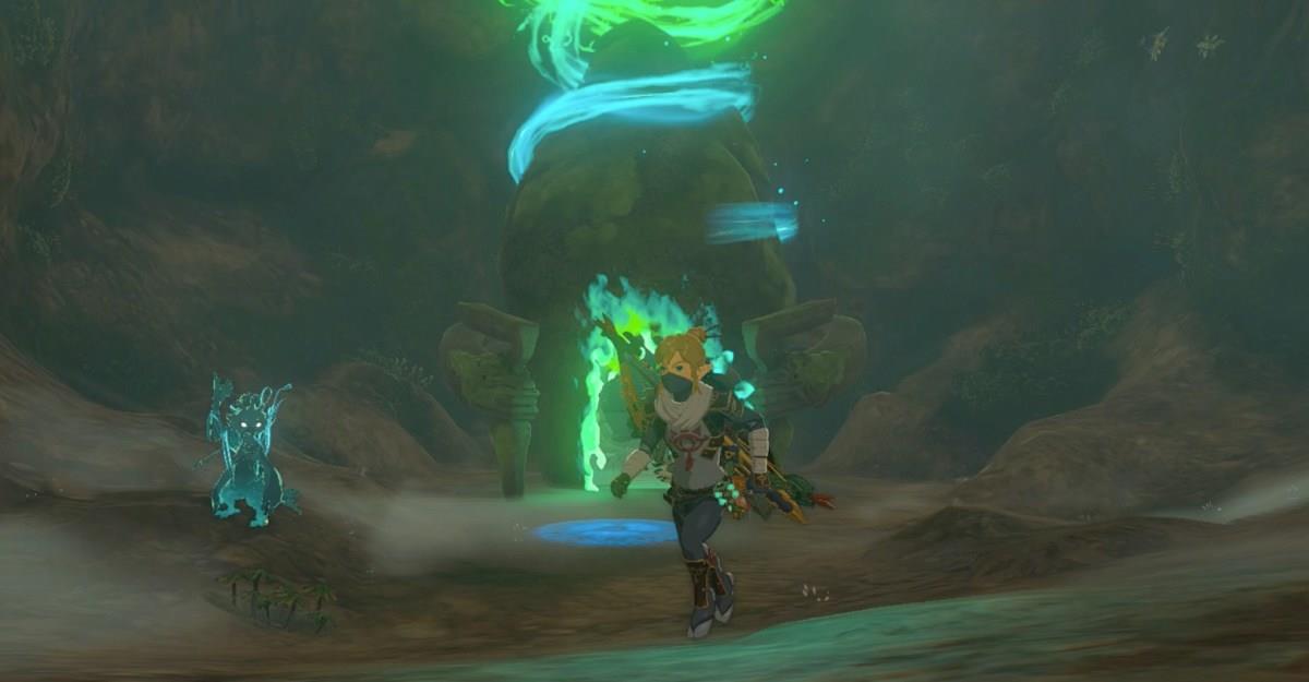 After examining the altar in the Mural Cave (southwest lake area), sail your boat east/south to the Large Cave Shrine dock. Fight through Ganados outside a locked stone door with a circular symbol panel.