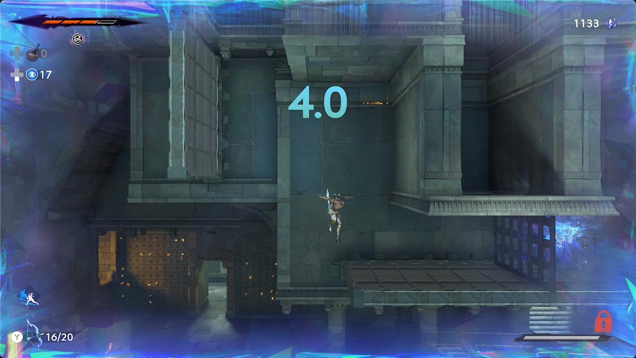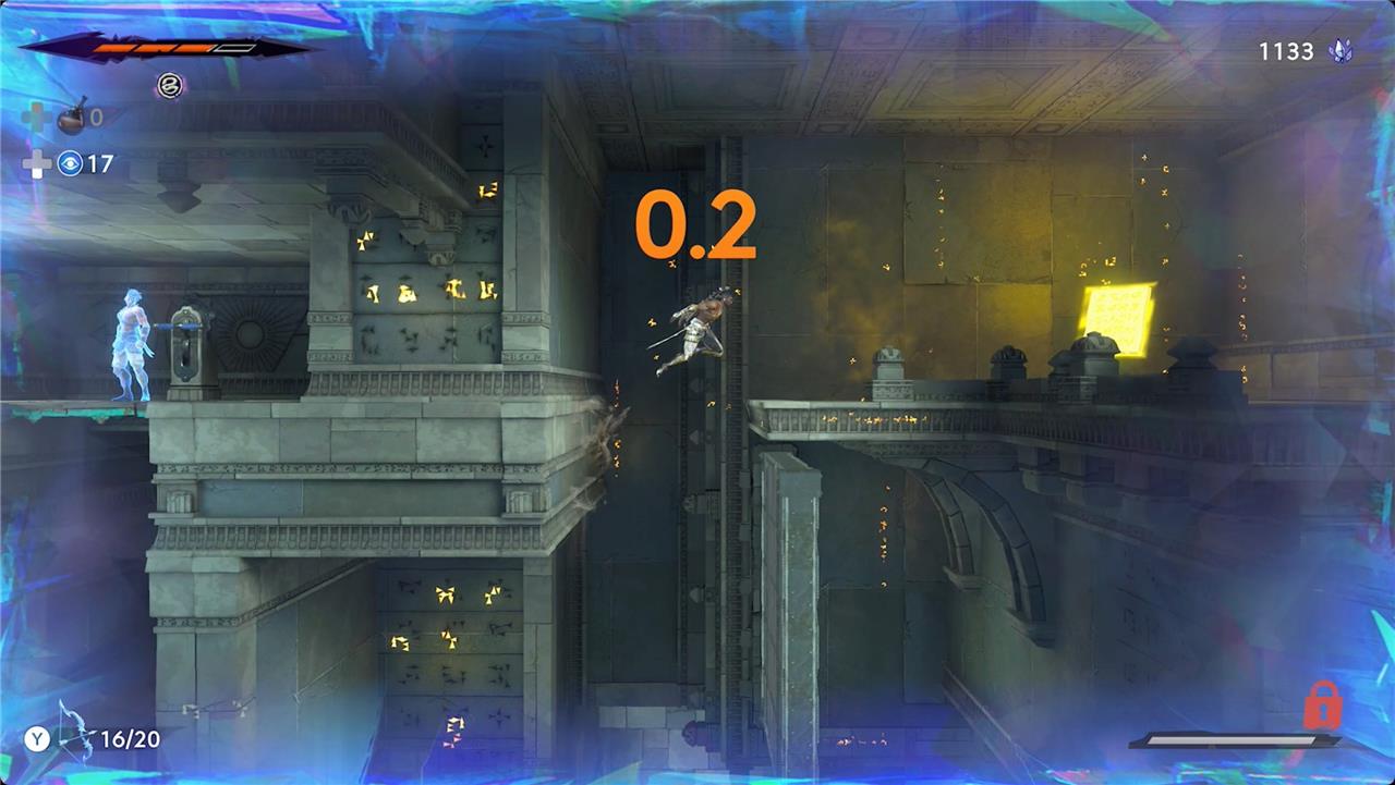 Trigger the puzzle, and then rush through the rooms – climb up and to the right, switch directions to continue up and to the left, and then drop into the U-shaped stretch on the left wall. You should make it about halfway up the wall before time runs out. Right before the clock hits zero, trigger the Shadow of the Simurgh ability with the left shoulder button (L1/LB).
