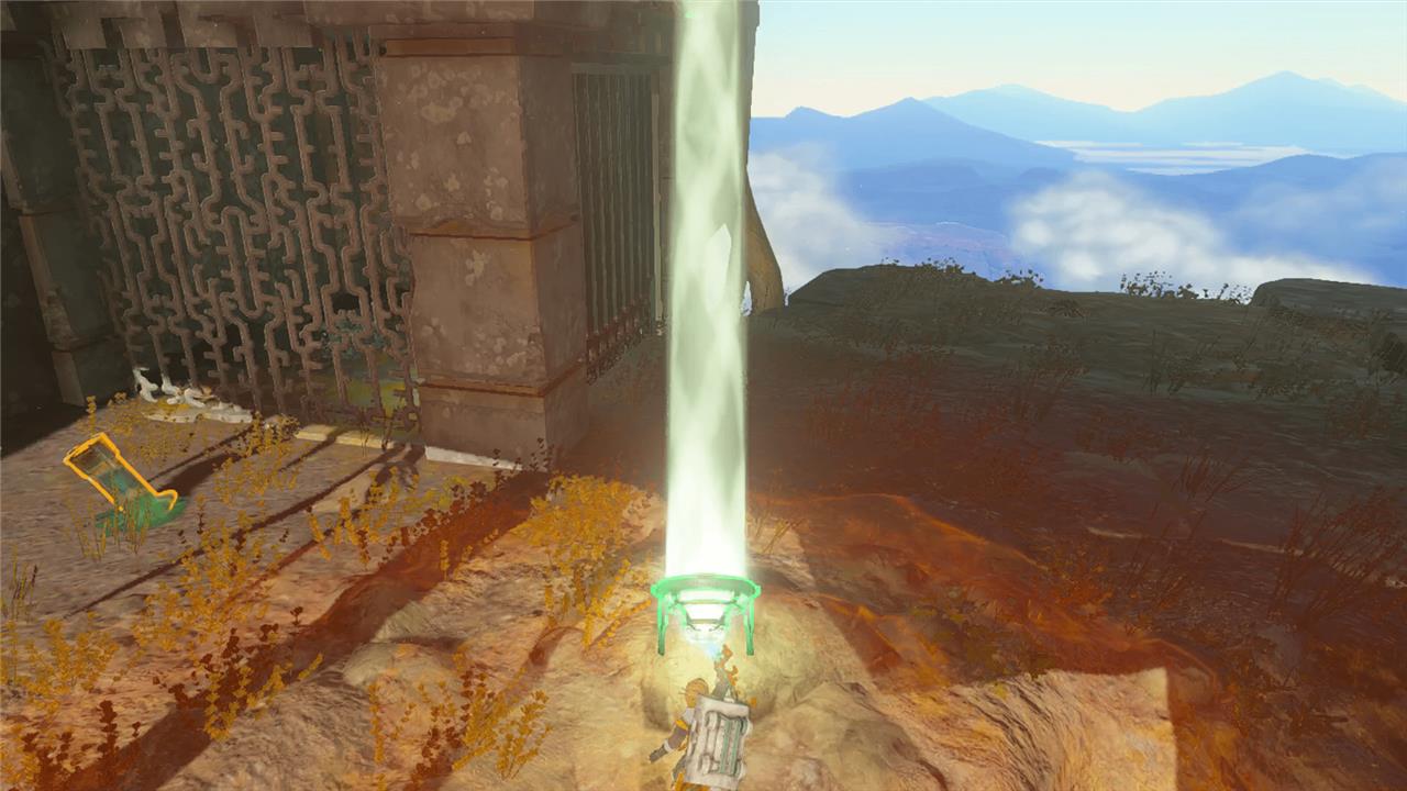 To solve the puzzle, start by rotating the crank in the middle until the light hits a mirror. Then keep following the light, rotating the cranks so they keep illuminating new mirrors. Before you aim the final crank toward the center, aim it at the horizontal light mechanism in front of the small ruins. This will open the ruins, allowing you to grab the Sage’s Will from the chest. Here’s a view of our light setup, from above the device dispenser: