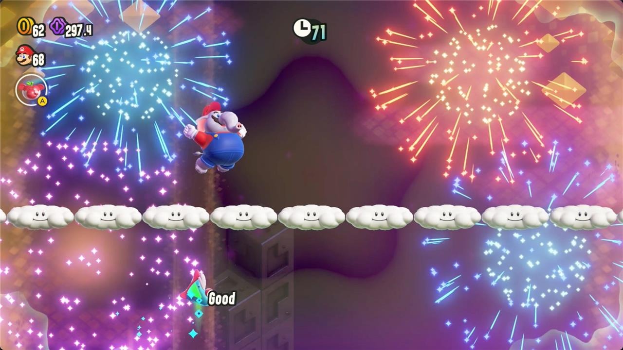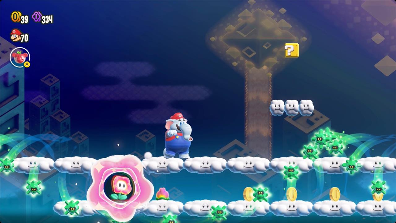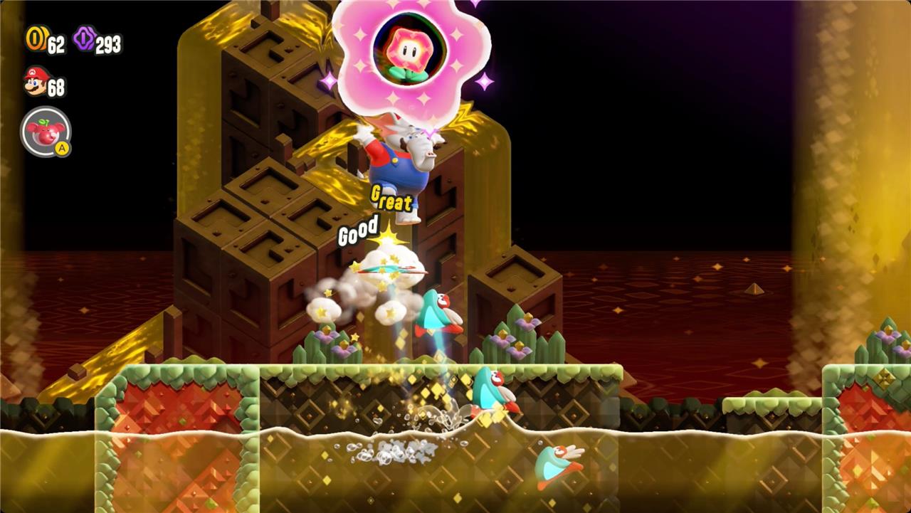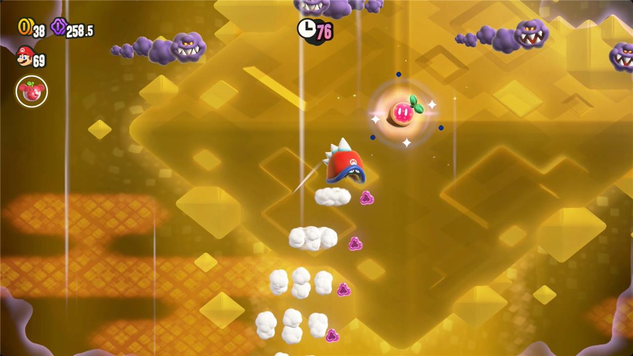 Most levels will have a Wonder Flower to collect. This special flower triggers a trippy reframing of the current level – sometimes the gravity disappears or you enter a twilight realm or multihued bubbles will carry you into the sky. Many of the Wonder Flower sequences end with a Wonder Seed.