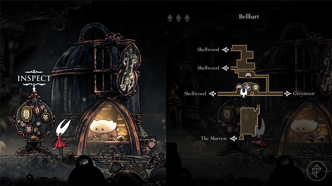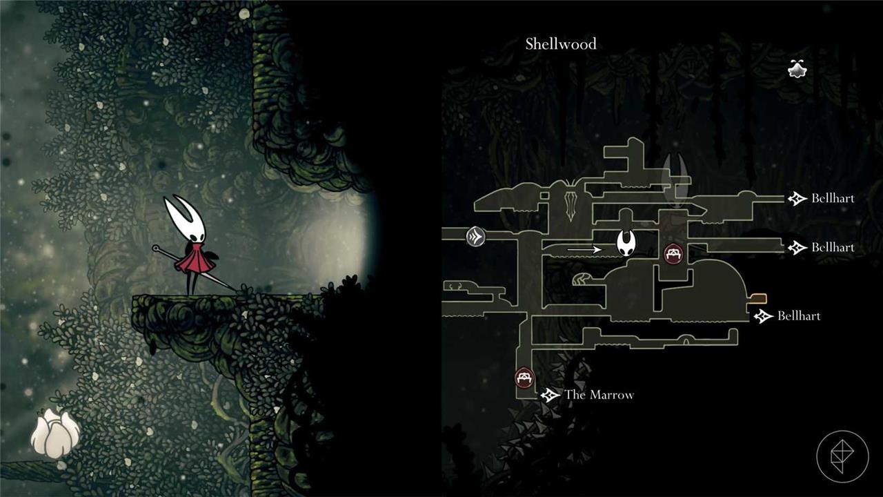 Starting from the Shellwood Bellway station, head right into the next room. The path downward is split into two sections: left and right. Glide over to the path on the right, and you’ll find an exit directly at the top of the path. Go inside and use your platforming skills to pogo your way across the enemies and plants ahead. At the end of the path, you’ll find a mask shard.