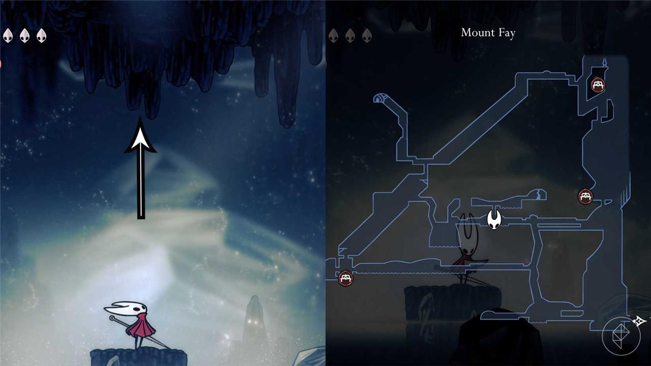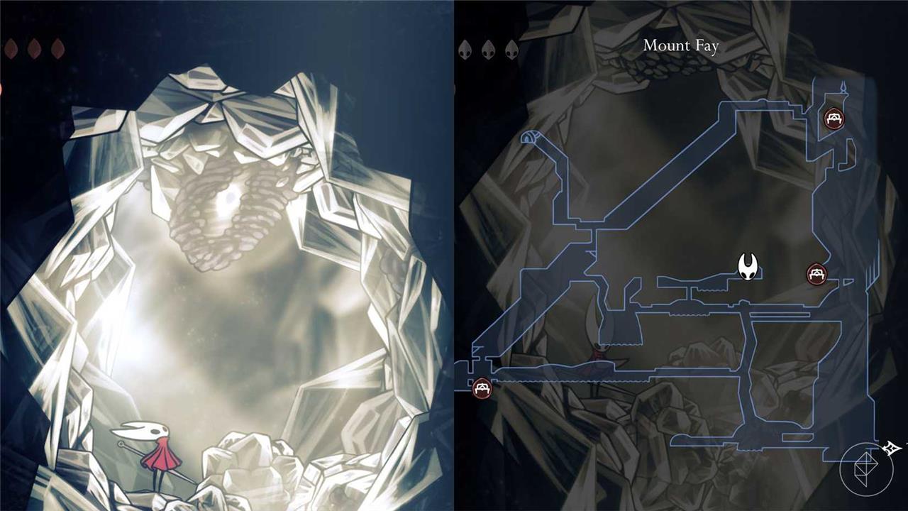 The mask shard in Mount Fay can be collected after you unlock the Faydown Cloak at the top of the mountain. Afterward, slide down the snowy mountainside and hop over the spikes until you reach the bottom left corner of the area. In this room, you’ll find a hollow pillar that you can double jump into, which just so happens to contain a mask shard.