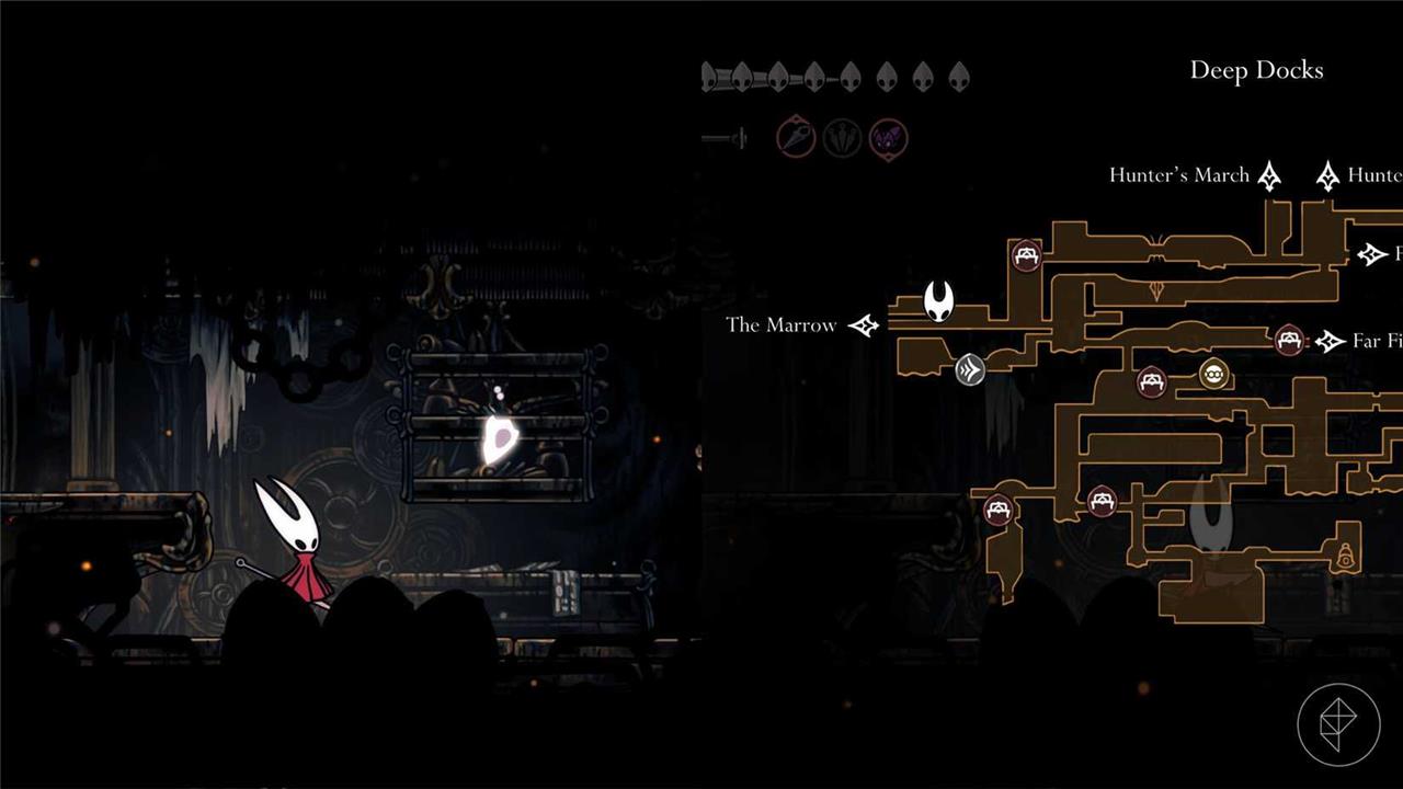 You’ve probably seen this mask shard as you rode the elevator up to the bench as soon as you entered the Deep Docks, but you can only grab this mask after you’ve unlocked the Cling Grip ability. This mask shard is found in the Deep Docks, but you’ll actually need to start in The Marrow. Make your way to the left side of the bottom right room of The Marrow, but don’t drop all the way to the bottom. Instead, take the upper path and continue to the right to find a vertical wall that you can climb. Jump across the platforms to the right to enter the Deep Docks, where you’ll encounter a gauntlet of enemies. After you defeat them, continue to the right to collect the mask shard.
