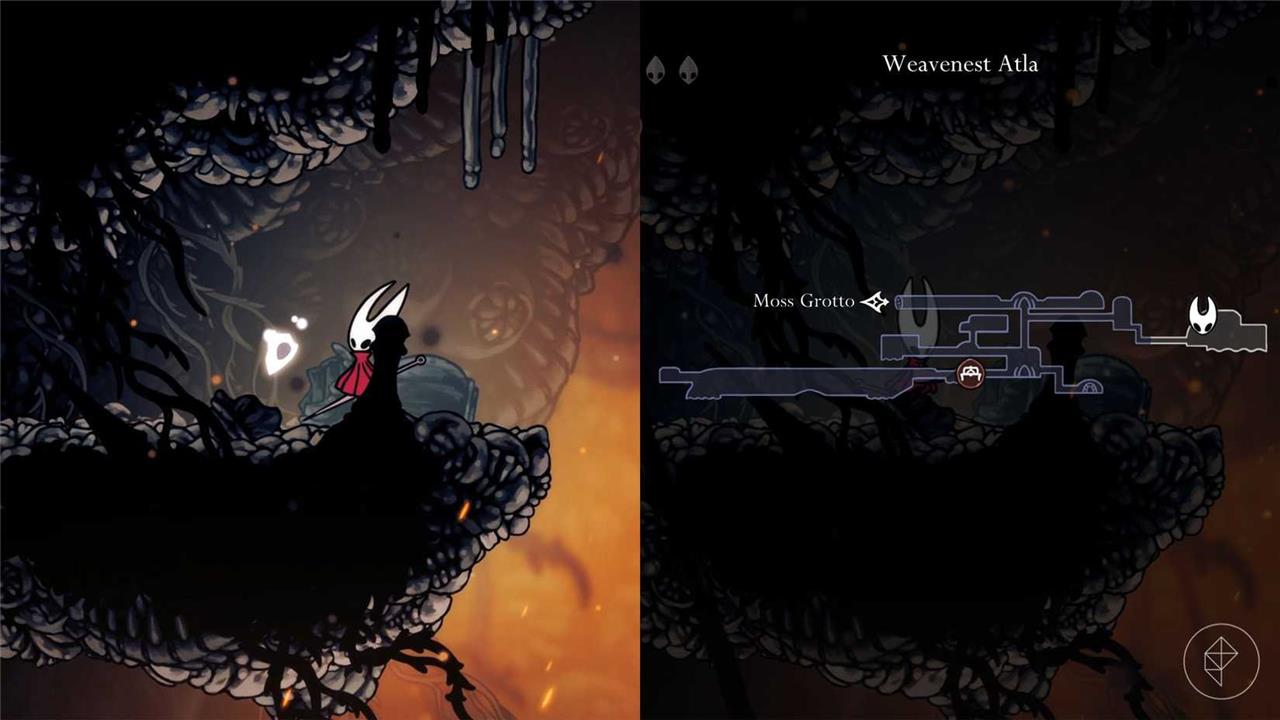 After unlocking the Needolin, return to the bottom right corner of Moss Grotto to find a door with a weaver’s face etched onto it. Play your Needolin to unlock the door and head inside. Power up Weavenest Alta by hitting the two silk spools in the far right room, and return to the glowing platform in the center of the hallway. If you step on it, you’ll be teleported to the bottom of Weavenest Alta. Use Cling Grip to jump up the wall on the right and onto the platform to your left. Climb up the open shaft and enter the first opening on your right. This will take you to a secret area of Weavenest Alta where your pogo skills will be put to the test.