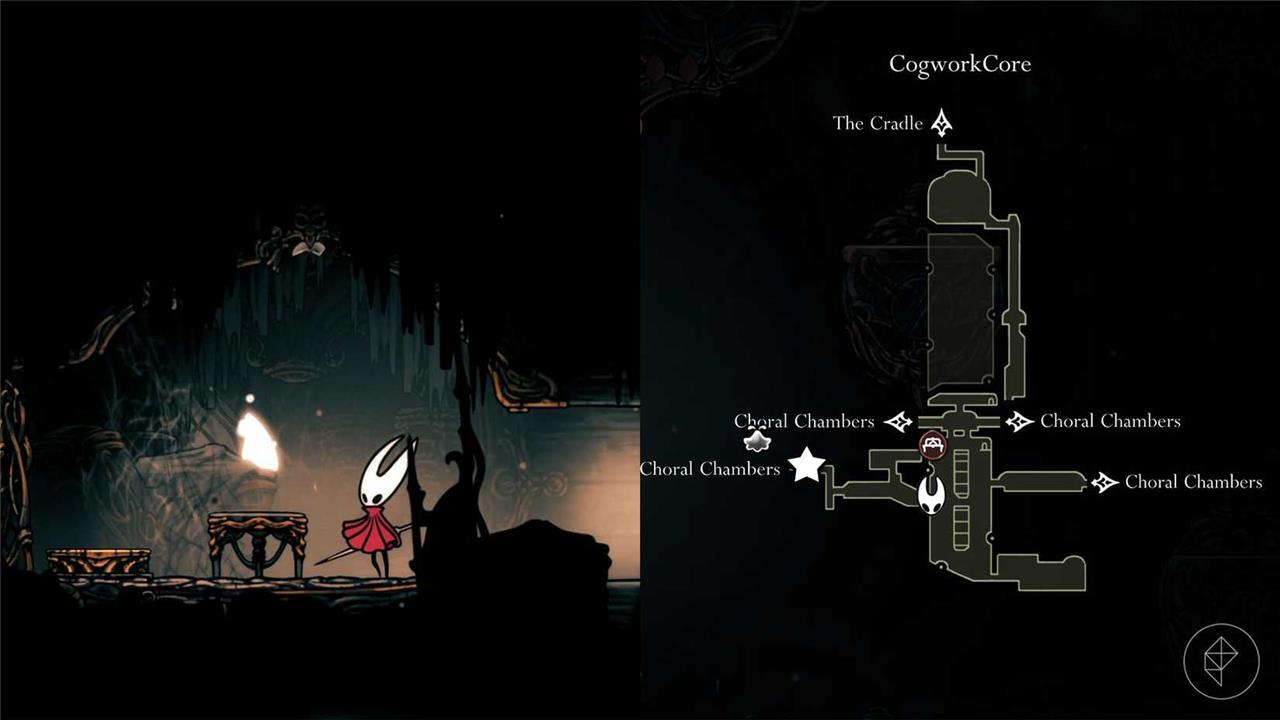 In this room, you’re going to need to put your pogo skills to the test as you’ll be pogoing off a moving gear. You’ll need to follow the gear all the way to the top where you’ll find a mask shard in the top left corner. If you lose track of the gear or it moves out of range, you will unfortunately need to start over from the very beginning.