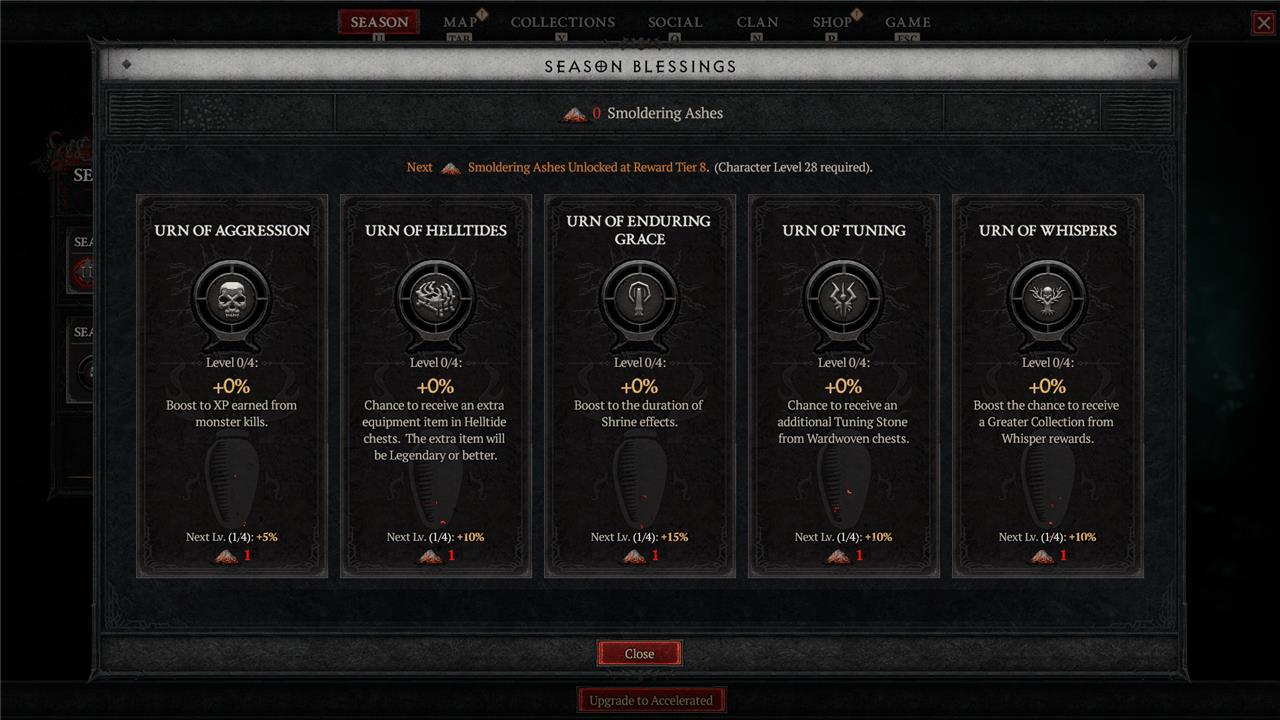 In order to pick up Smoldering Ashes, you have to meet two criteria. The first is that you upgrade your Battle Pass to a certain tier level. The second is that your character level matches the level requirement of the Smoldering Ash. Following changes introduced back in season 2, you’re now able to max out your blessings at level 82 instead of level 100 (assuming you hit 88 on your Battle Pass, that is).