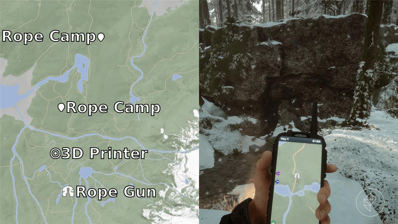 Ziplines can be created by equipping the rope gun, then shooting it to a point on the environment; this will create one of the ends of the zipline. (A white dot will appear on the screen when equipped showing you where the zipline will be placed.) After the first point is placed, shoot the rope gun again to place the other end of the zipline. You’ll need zipline rope, which can be created by combining one rope and one printed grappling hook. Check the next section to learn where you can find a nearby 3D printer and camp to find rope.