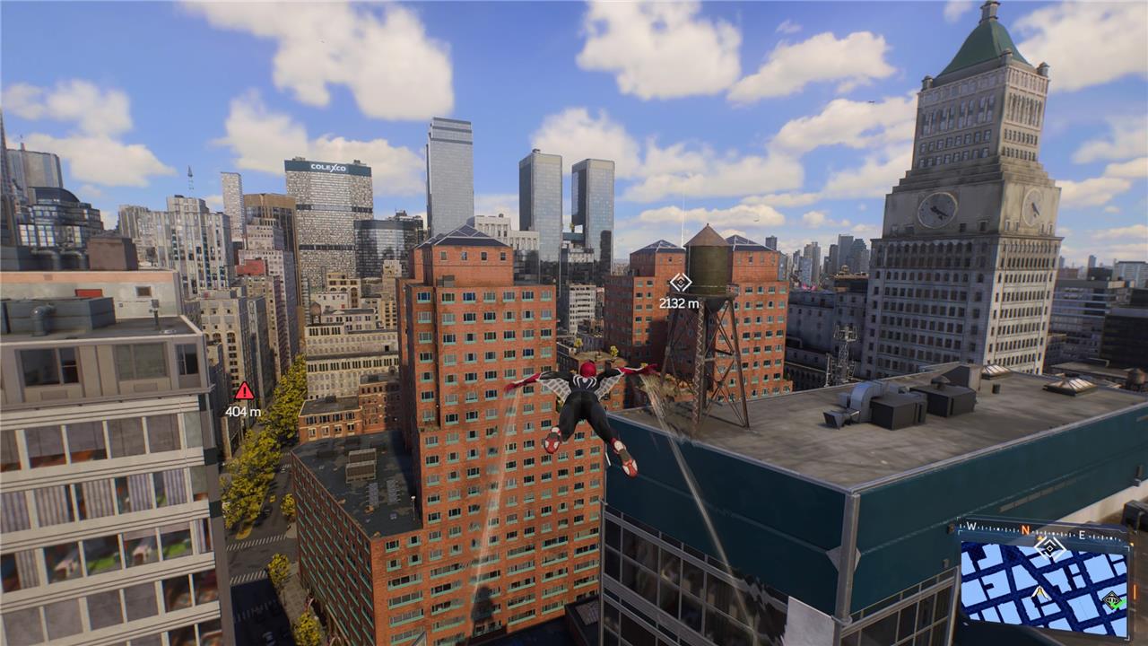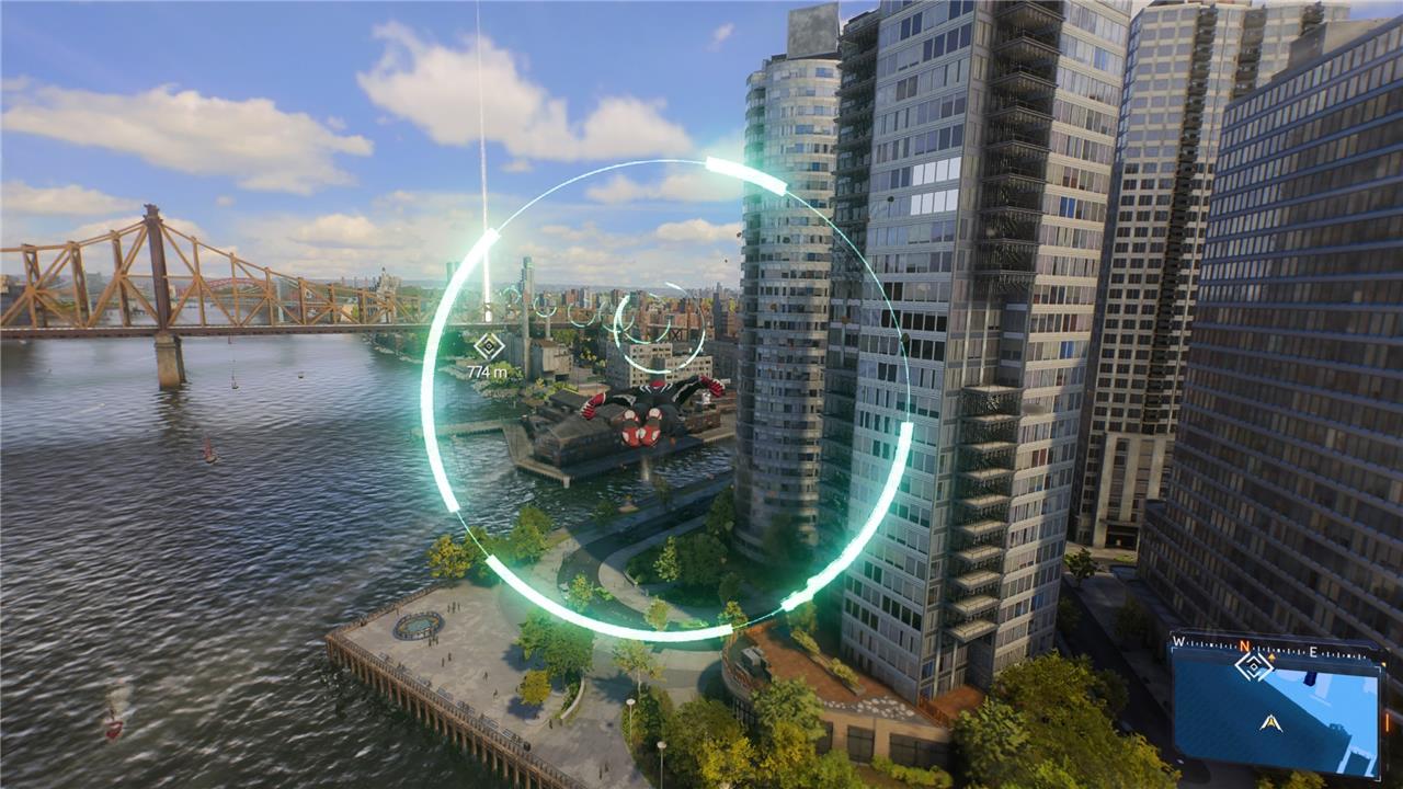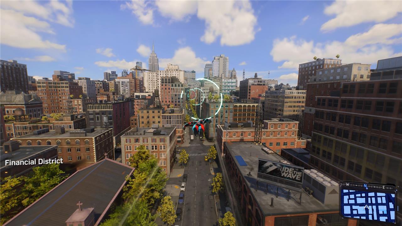 To start, head to the Wind Tunnel located in the northeast area of the Financial District. You can do this by fast traveling onto the street, and in our experience, if you fast travel near the tunnel, Spider-Man will activate his Web Wings as soon as you gain control. However, you can also access the tunnel by gaining some momentum and jumping from an adjoining tall building. Once you’re in its flow, follow this wind tunnel along until it runs out.
