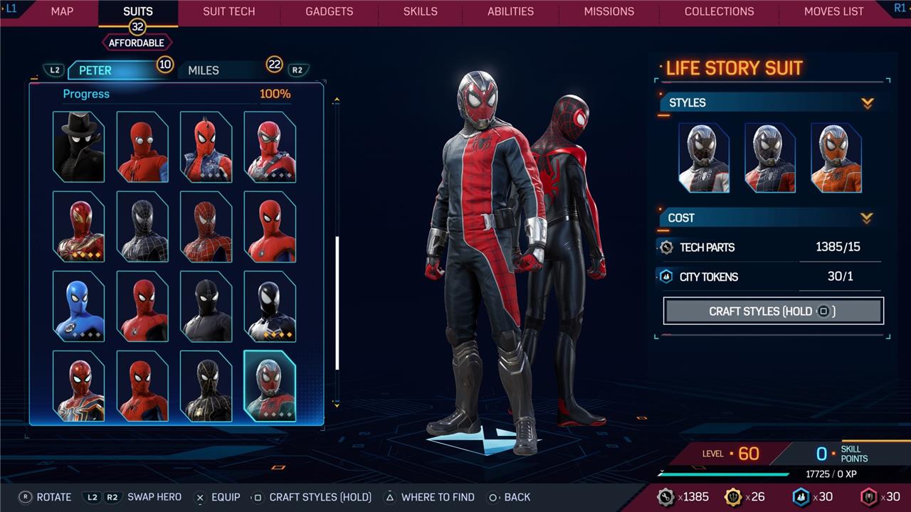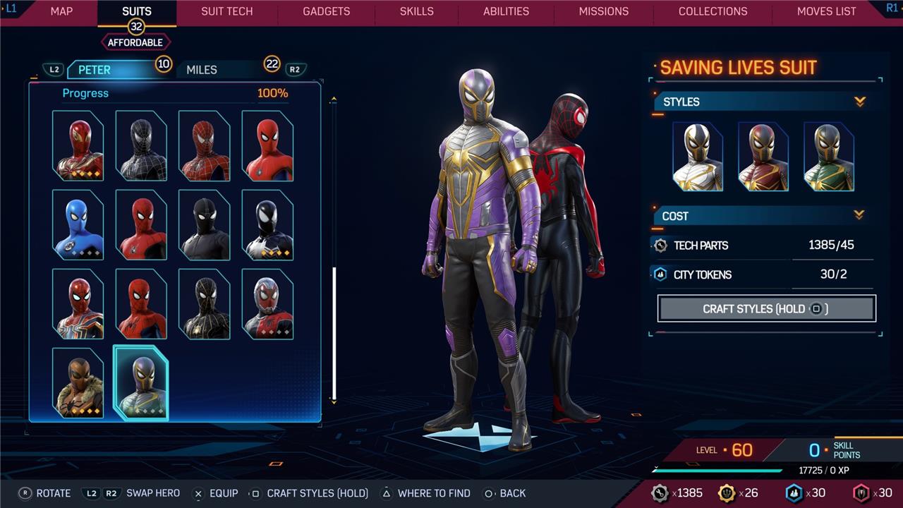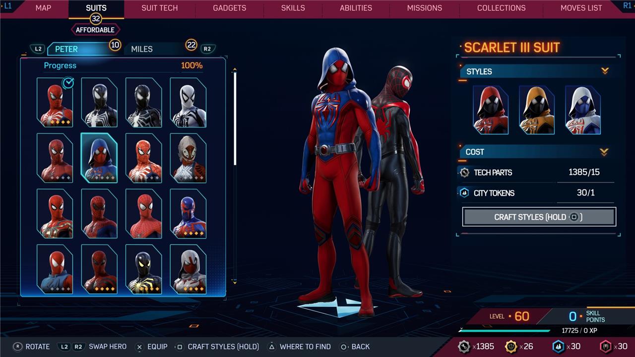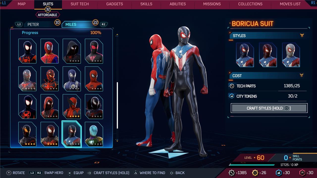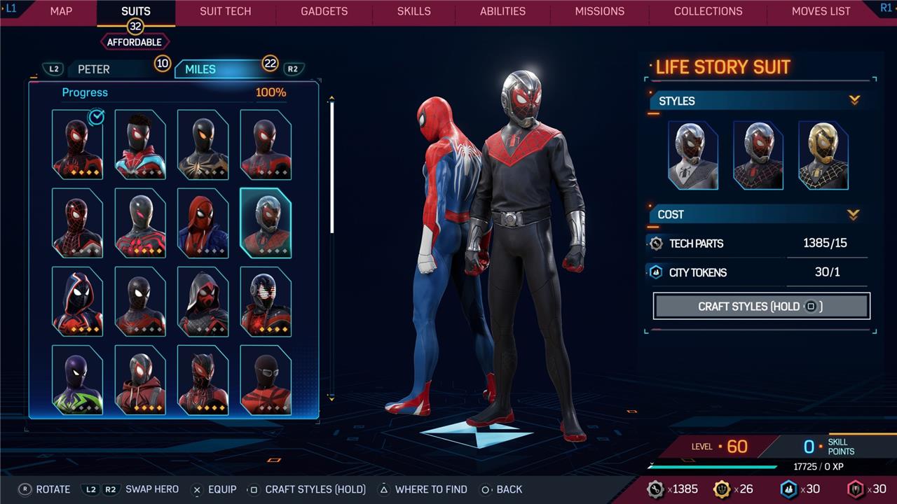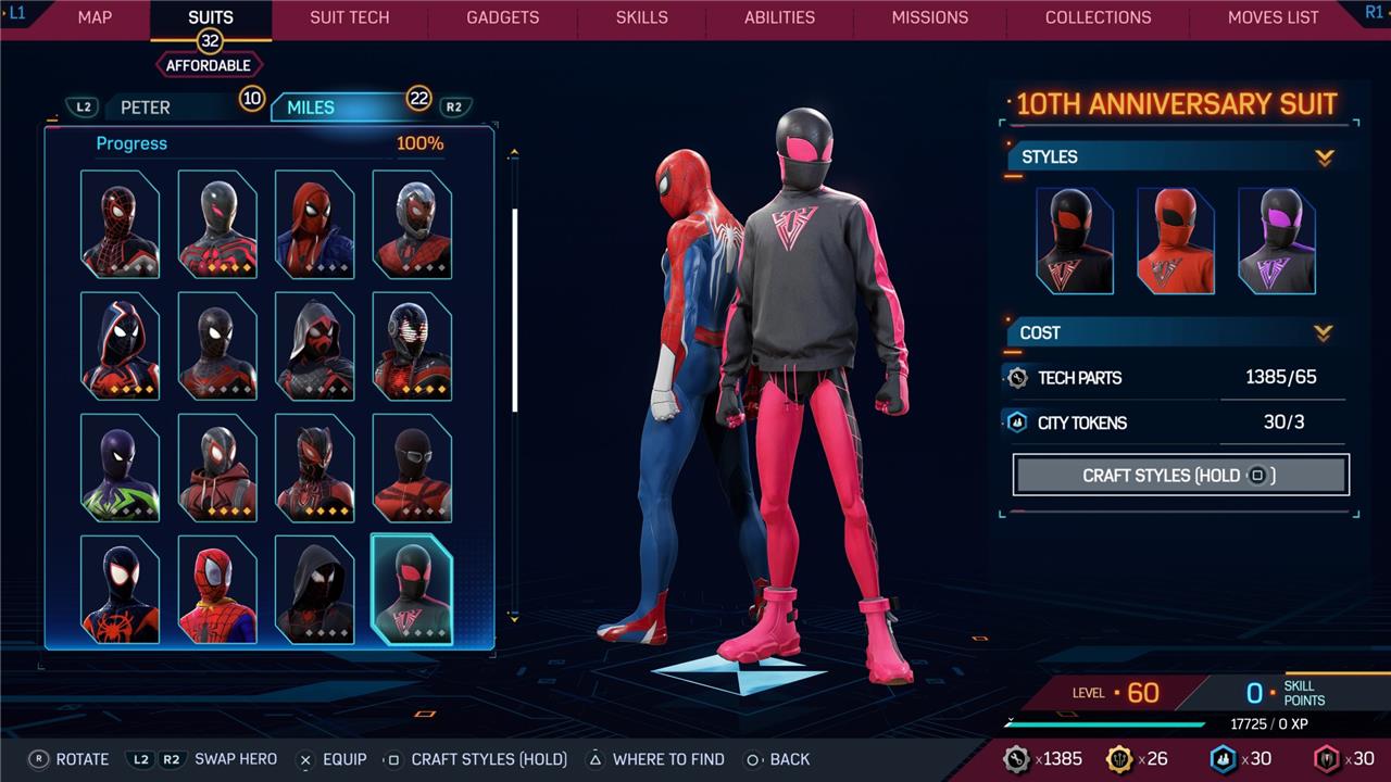 Marvel’s Spider-Man 2 offers an extensive collection of suits for both Peter Parker and Miles Morales, totaling 68 in the base game, with additional suits available through the Digital Deluxe Edition and DLC, bringing the total to 90. Players unlock most suits by progressing through the story, reaching certain character levels, or completing specific missions and side activities. Each suit often comes with multiple color variations called Styles, which require crafting using materials like Tech Parts, City Tokens, Rare Tech Parts, and Hero Tokens earned throughout gameplay. The Suits tab unlocks after a key story mission, allowing players to craft and customize their favorite outfits, enhancing both aesthetics and gameplay experience across PC and PlayStation platforms.