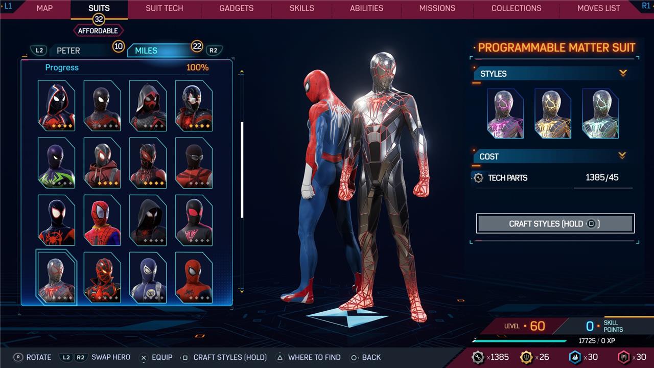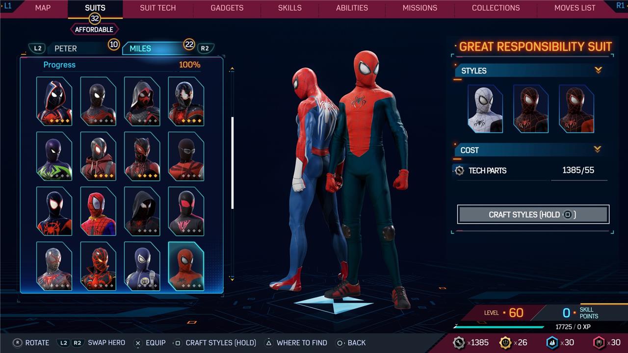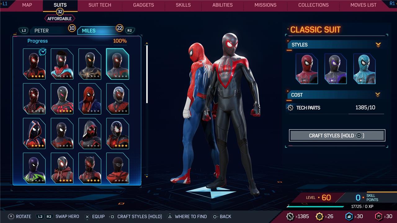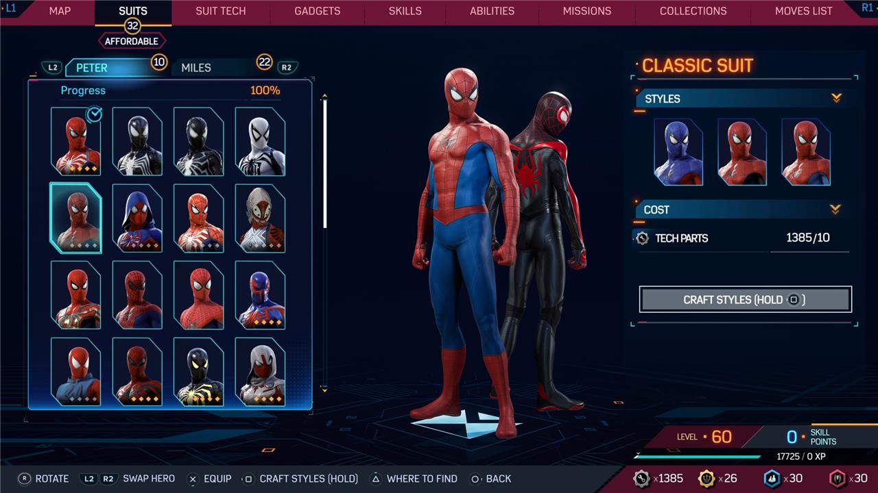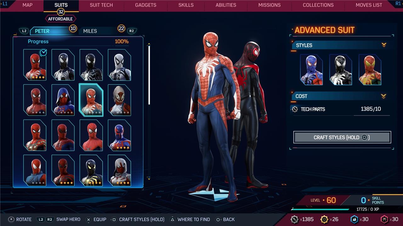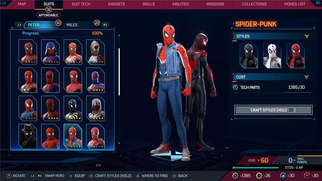 Marvel’s Spider-Man 2 offers an extensive collection of suits for both Peter Parker and Miles Morales, totaling 68 in the base game, with additional suits available through the Digital Deluxe Edition and DLC, bringing the total to 90. Players unlock most suits by progressing through the story, reaching certain character levels, or completing specific missions and side activities. Each suit often comes with multiple color variations called Styles, which require crafting using materials like Tech Parts, City Tokens, Rare Tech Parts, and Hero Tokens earned throughout gameplay. The Suits tab unlocks after a key story mission, allowing players to craft and customize their favorite outfits, enhancing both aesthetics and gameplay experience across PC and PlayStation platforms.