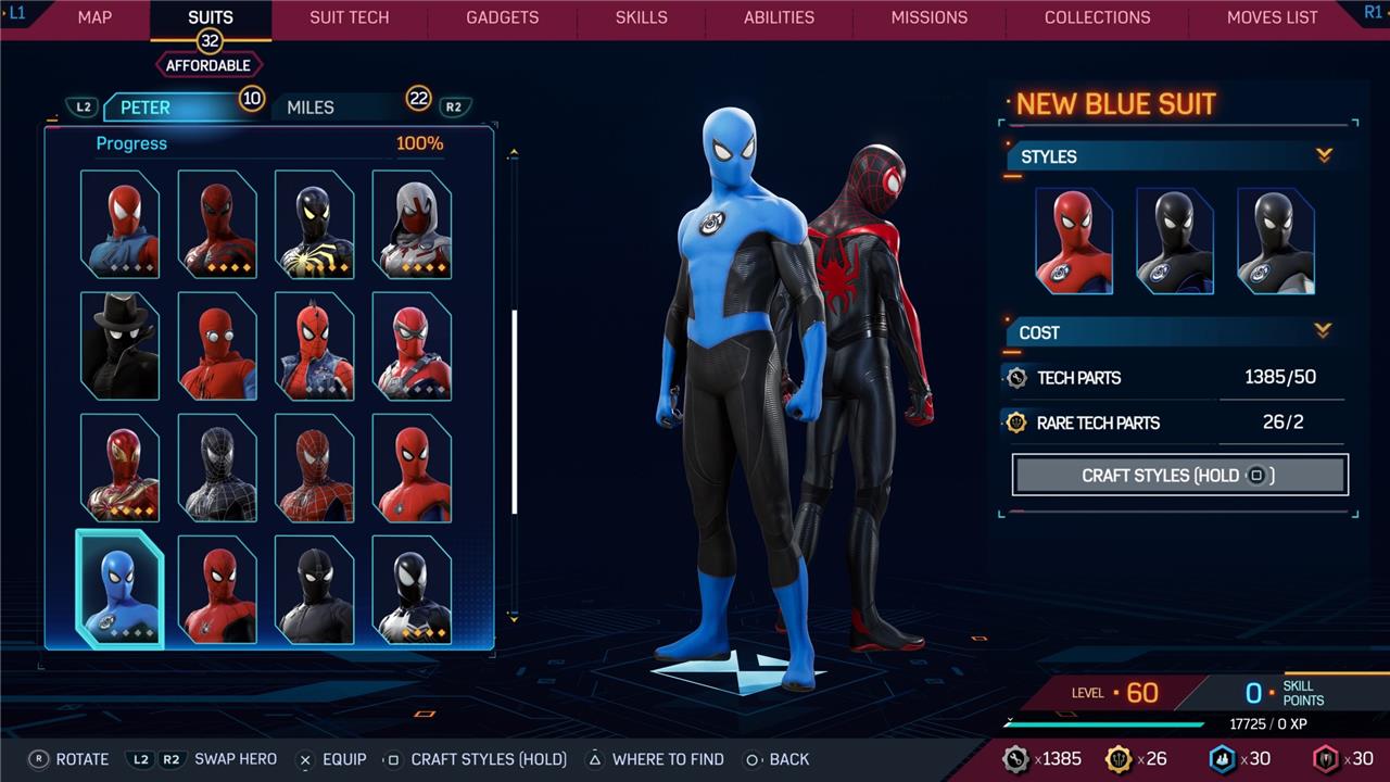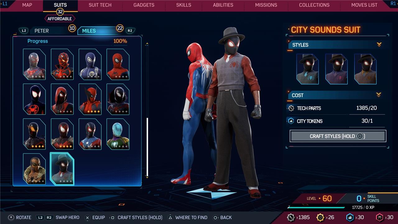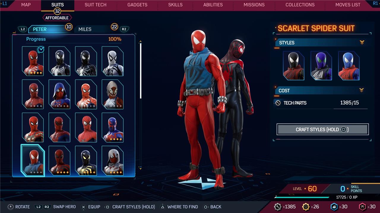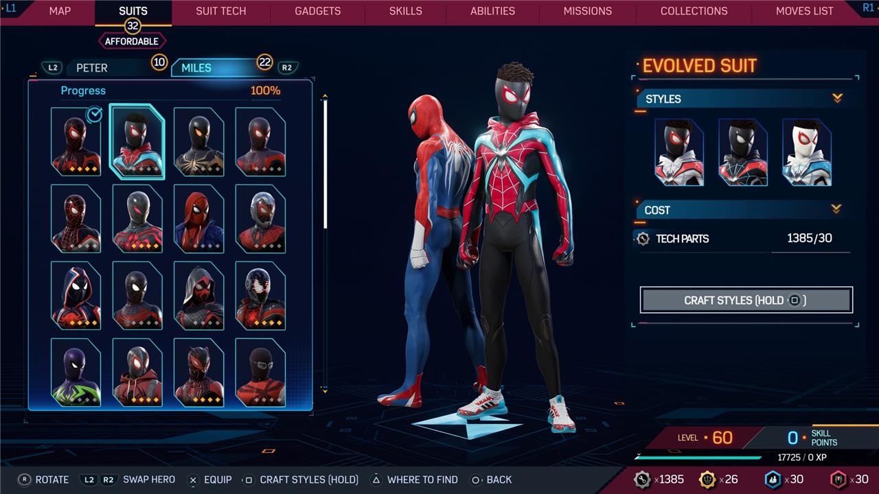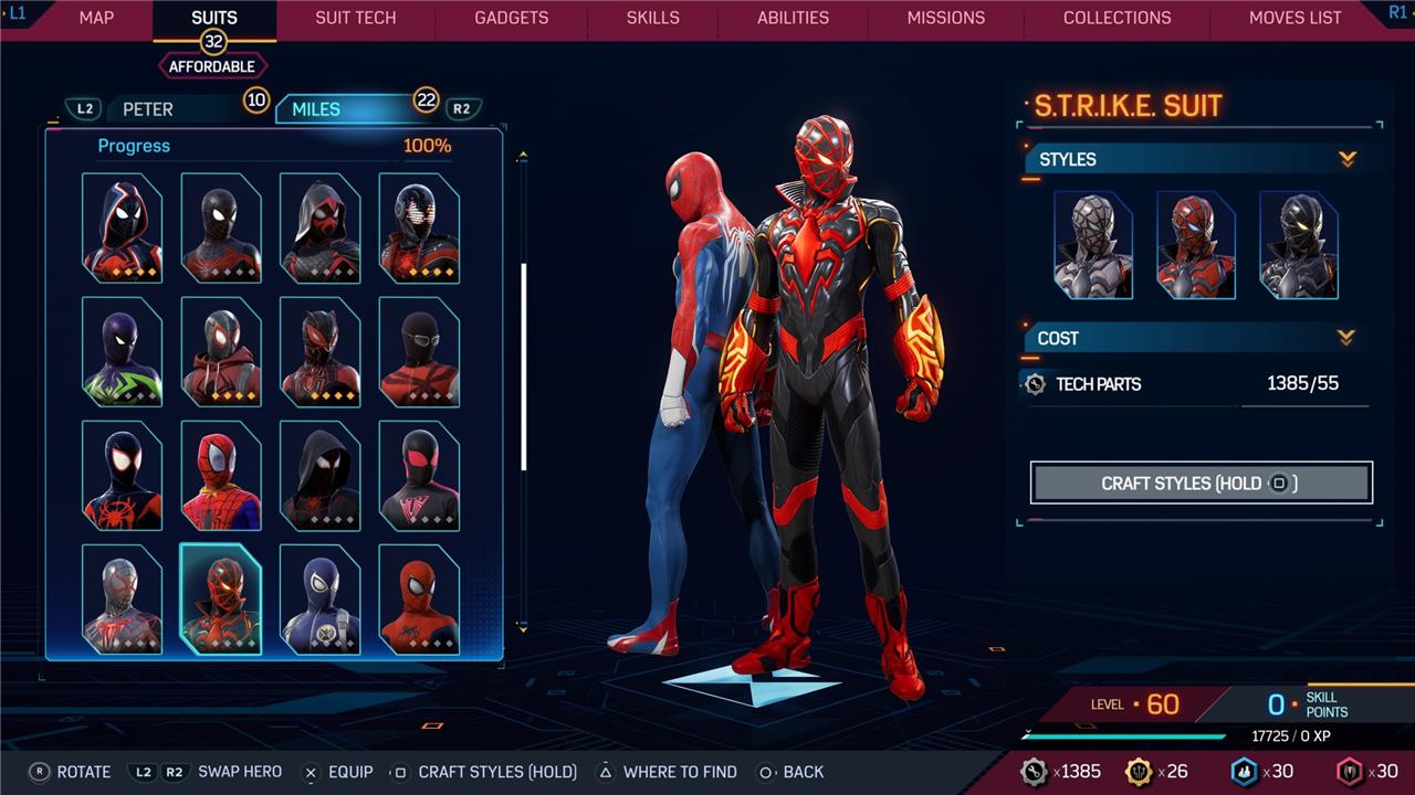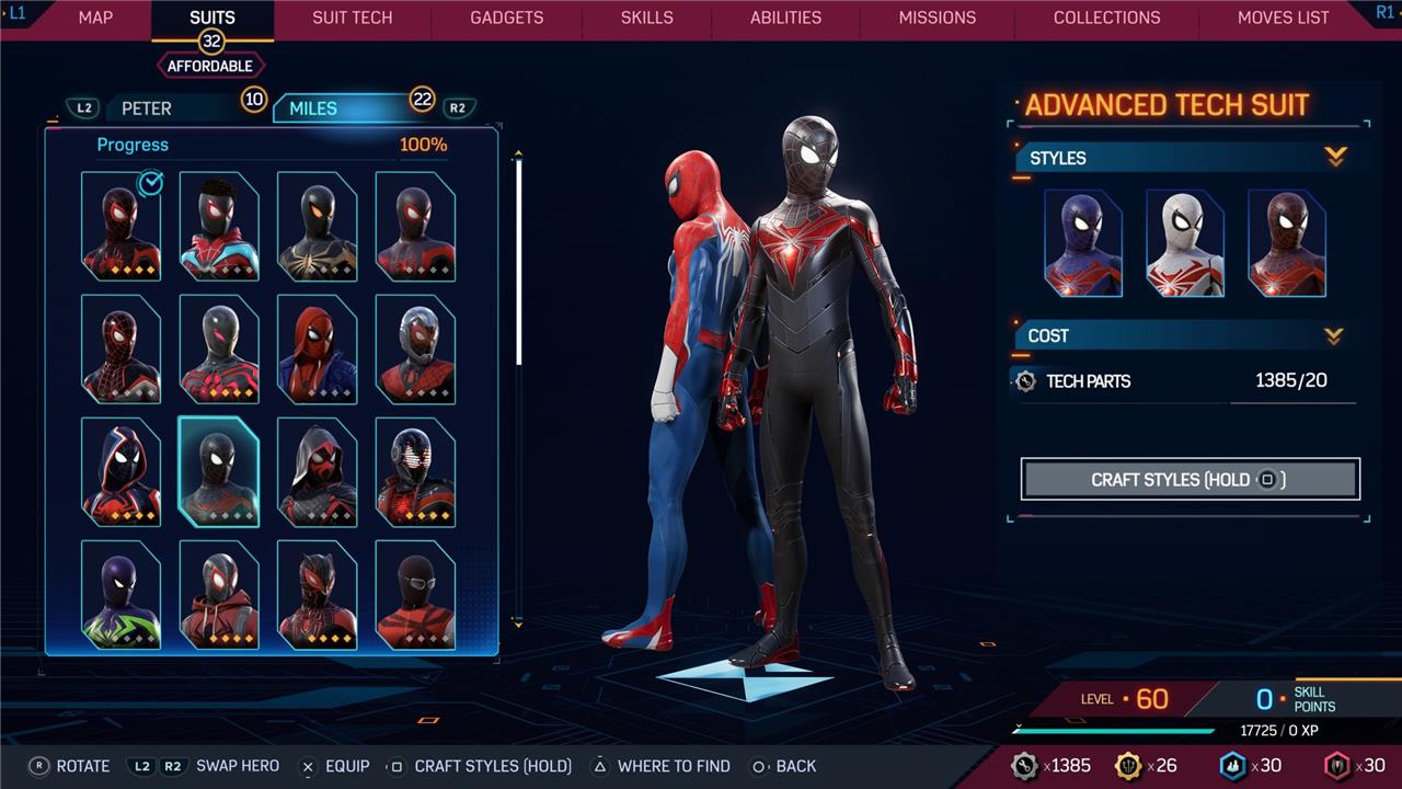 Marvel’s Spider-Man 2 offers an extensive collection of suits for both Peter Parker and Miles Morales, totaling 68 in the base game, with additional suits available through the Digital Deluxe Edition and DLC, bringing the total to 90. Players unlock most suits by progressing through the story, reaching certain character levels, or completing specific missions and side activities. Each suit often comes with multiple color variations called Styles, which require crafting using materials like Tech Parts, City Tokens, Rare Tech Parts, and Hero Tokens earned throughout gameplay. The Suits tab unlocks after a key story mission, allowing players to craft and customize their favorite outfits, enhancing both aesthetics and gameplay experience across PC and PlayStation platforms.