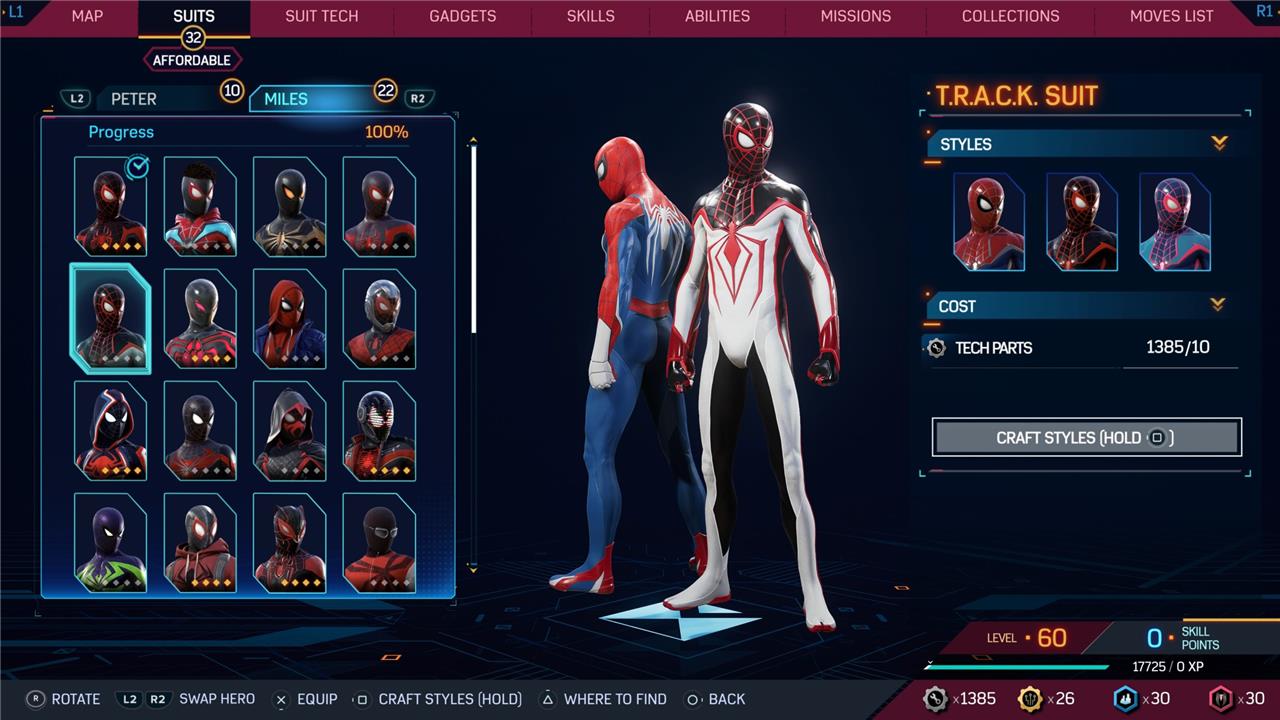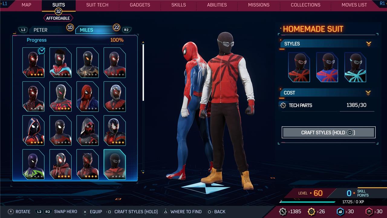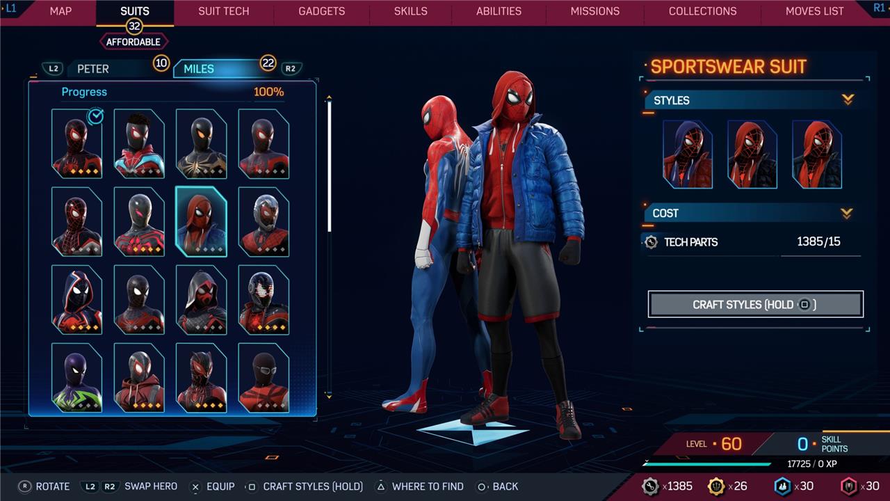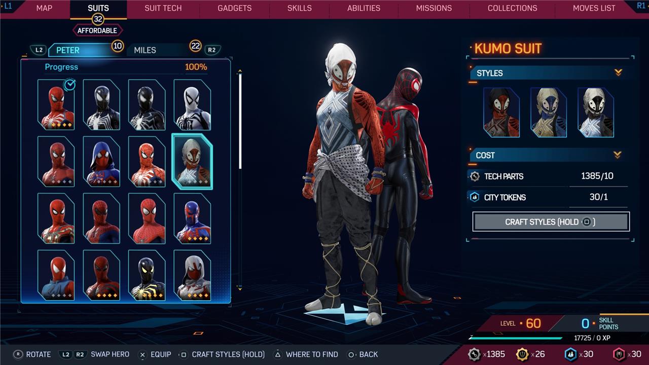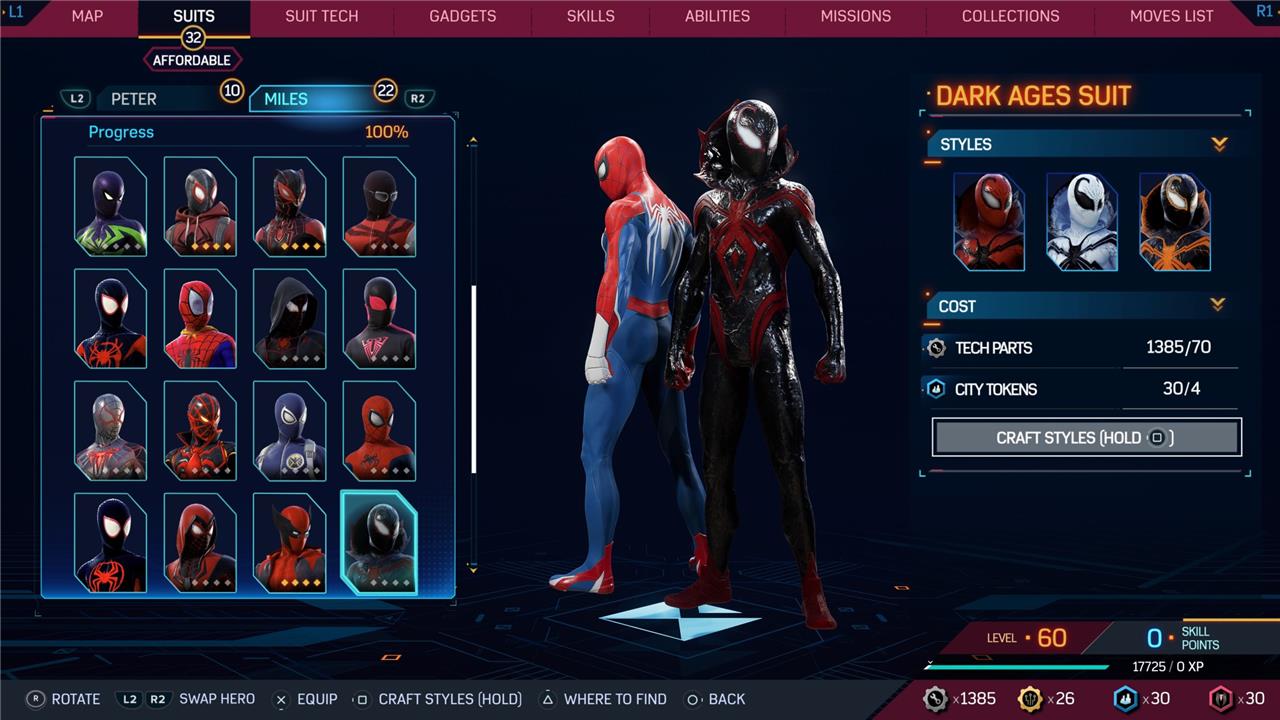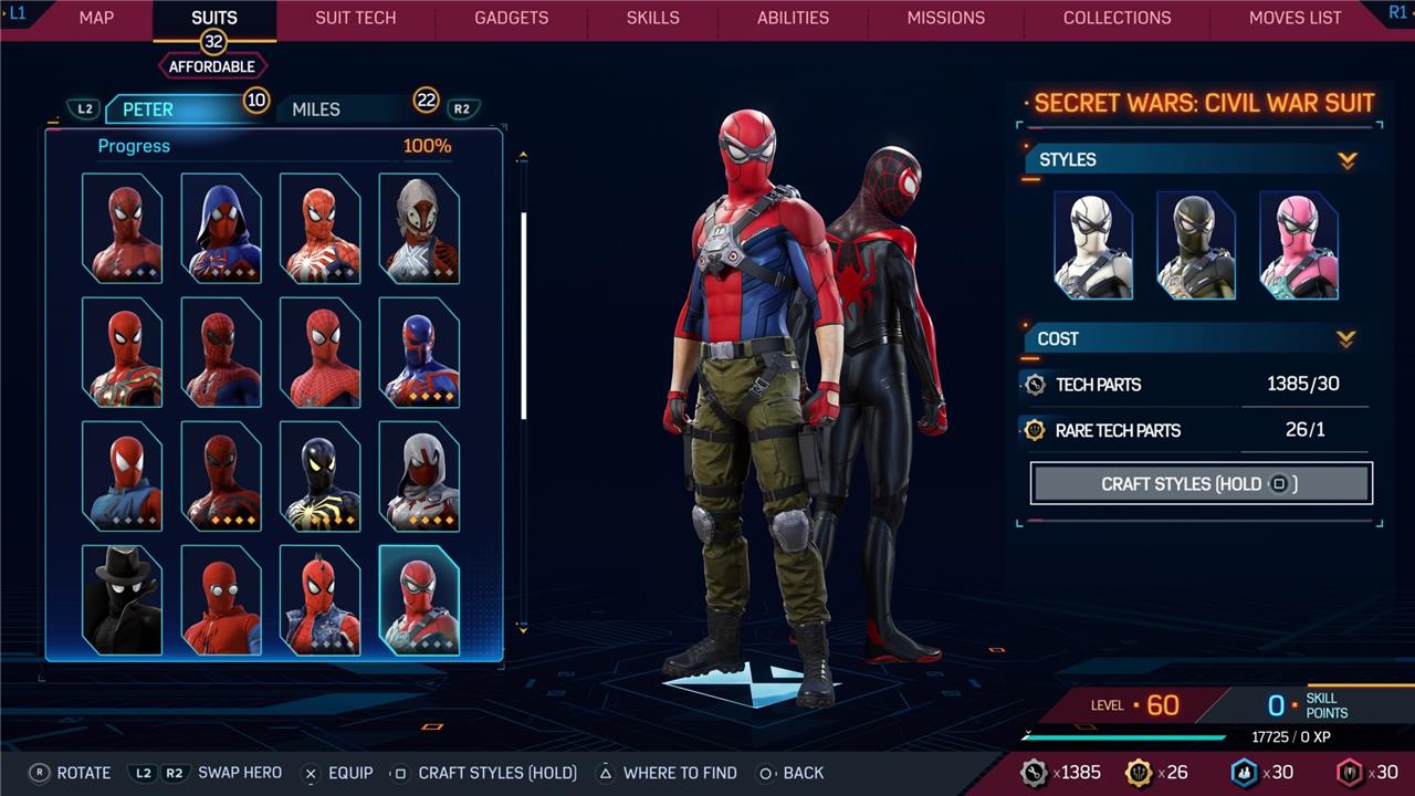 Marvel’s Spider-Man 2 offers an extensive collection of suits for both Peter Parker and Miles Morales, totaling 68 in the base game, with additional suits available through the Digital Deluxe Edition and DLC, bringing the total to 90. Players unlock most suits by progressing through the story, reaching certain character levels, or completing specific missions and side activities. Each suit often comes with multiple color variations called Styles, which require crafting using materials like Tech Parts, City Tokens, Rare Tech Parts, and Hero Tokens earned throughout gameplay. The Suits tab unlocks after a key story mission, allowing players to craft and customize their favorite outfits, enhancing both aesthetics and gameplay experience across PC and PlayStation platforms.