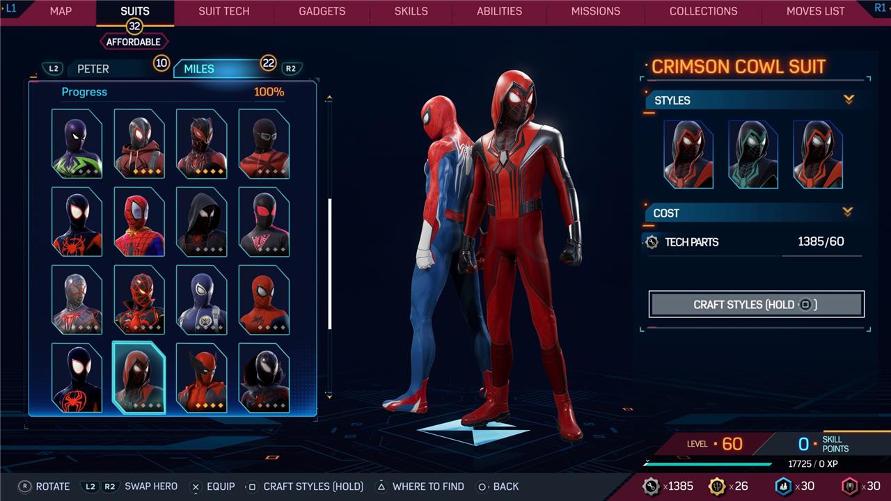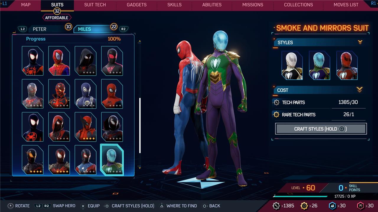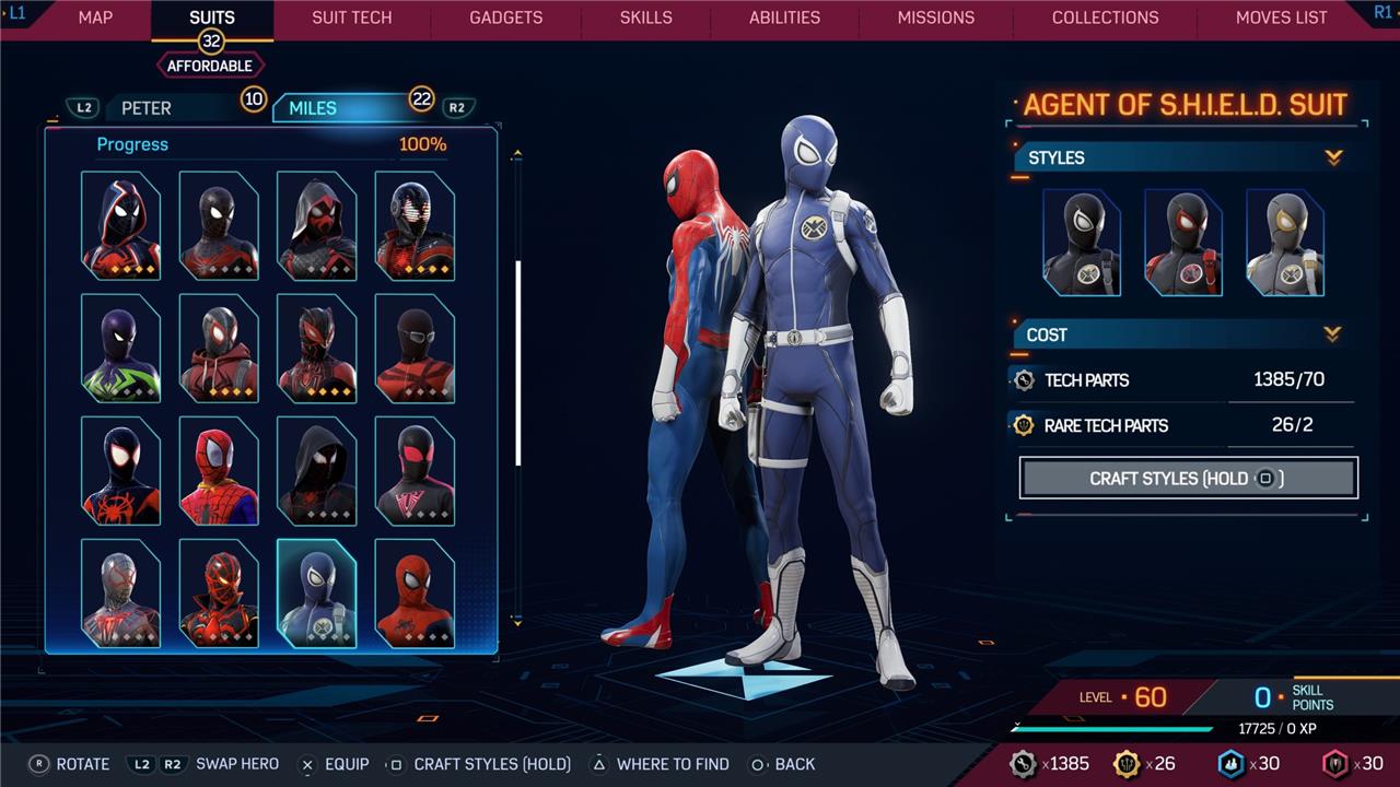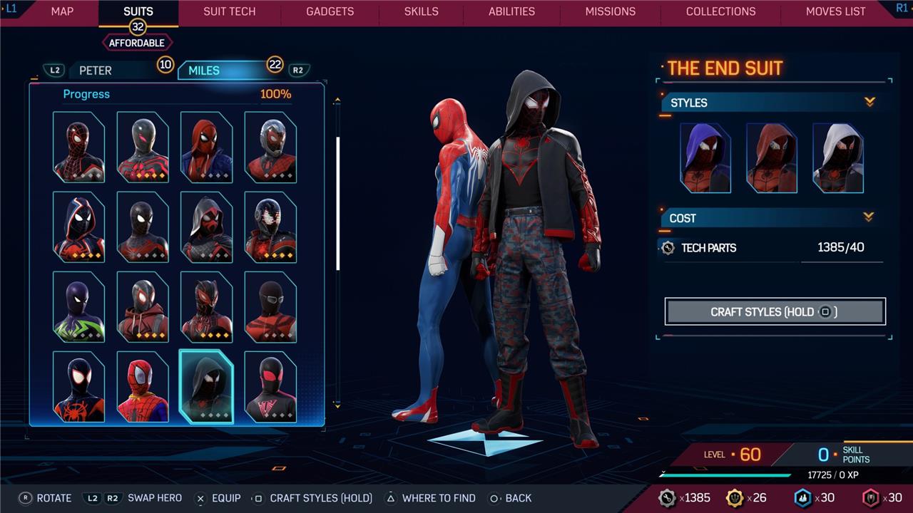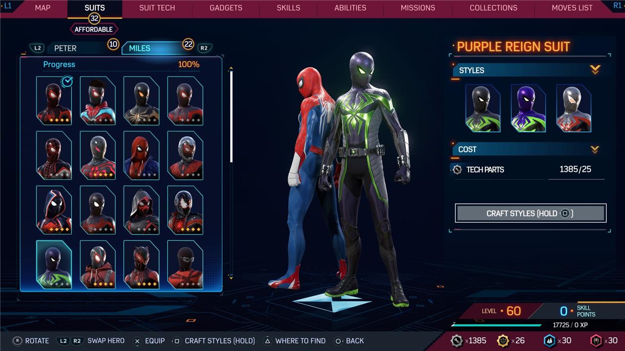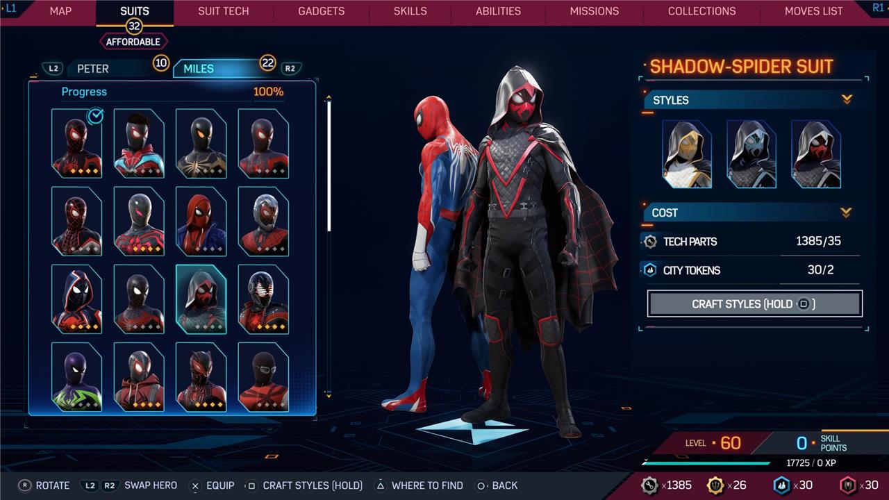 Marvel’s Spider-Man 2 offers an extensive collection of suits for both Peter Parker and Miles Morales, totaling 68 in the base game, with additional suits available through the Digital Deluxe Edition and DLC, bringing the total to 90. Players unlock most suits by progressing through the story, reaching certain character levels, or completing specific missions and side activities. Each suit often comes with multiple color variations called Styles, which require crafting using materials like Tech Parts, City Tokens, Rare Tech Parts, and Hero Tokens earned throughout gameplay. The Suits tab unlocks after a key story mission, allowing players to craft and customize their favorite outfits, enhancing both aesthetics and gameplay experience across PC and PlayStation platforms.