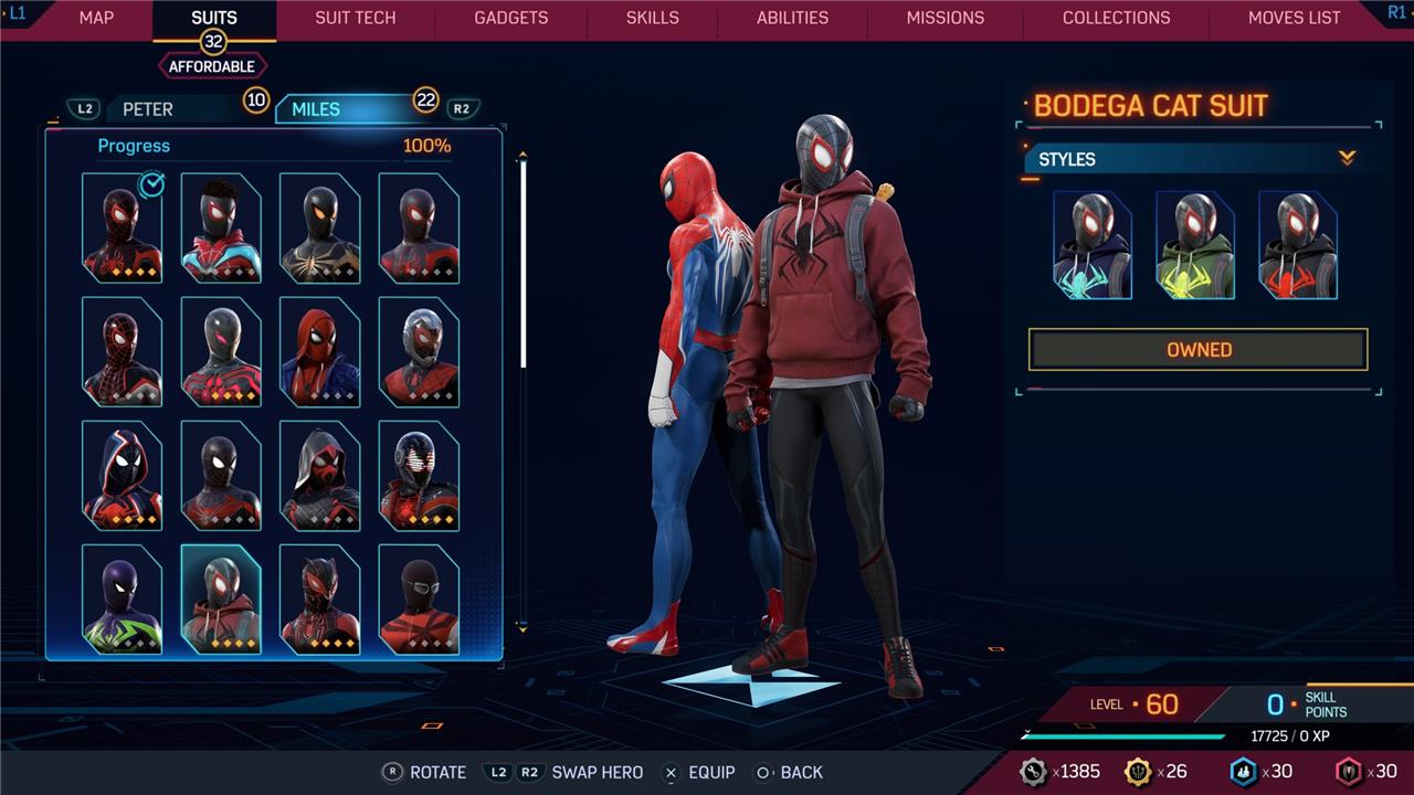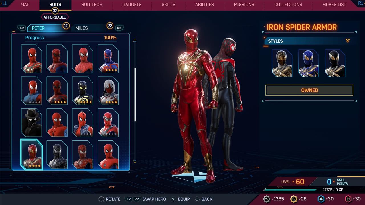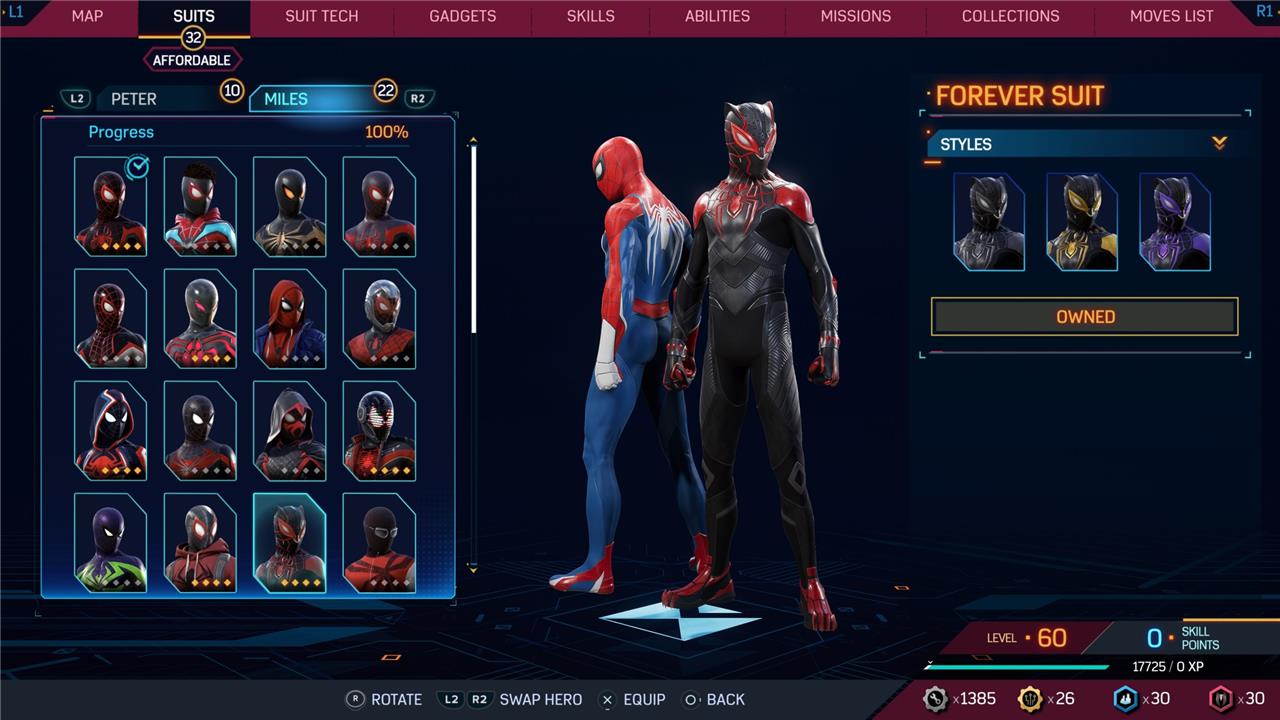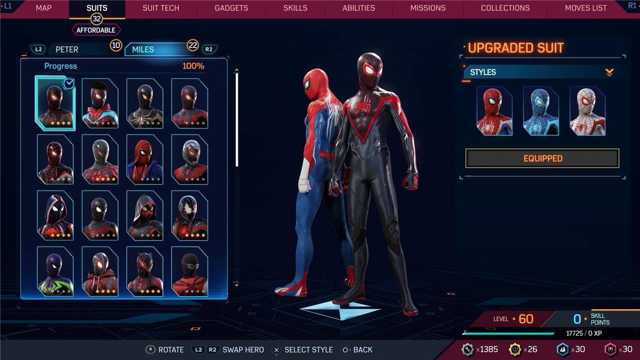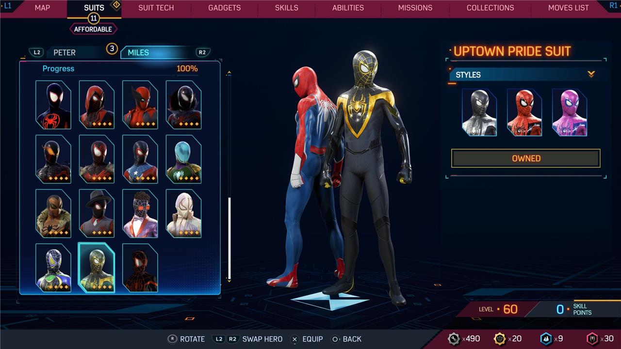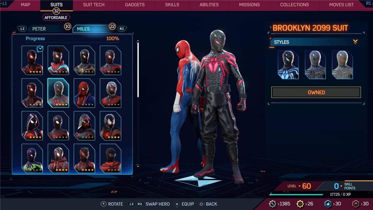 Marvel’s Spider-Man 2 offers an extensive collection of suits for both Peter Parker and Miles Morales, totaling 68 in the base game, with additional suits available through the Digital Deluxe Edition and DLC, bringing the total to 90. Players unlock most suits by progressing through the story, reaching certain character levels, or completing specific missions and side activities. Each suit often comes with multiple color variations called Styles, which require crafting using materials like Tech Parts, City Tokens, Rare Tech Parts, and Hero Tokens earned throughout gameplay. The Suits tab unlocks after a key story mission, allowing players to craft and customize their favorite outfits, enhancing both aesthetics and gameplay experience across PC and PlayStation platforms.