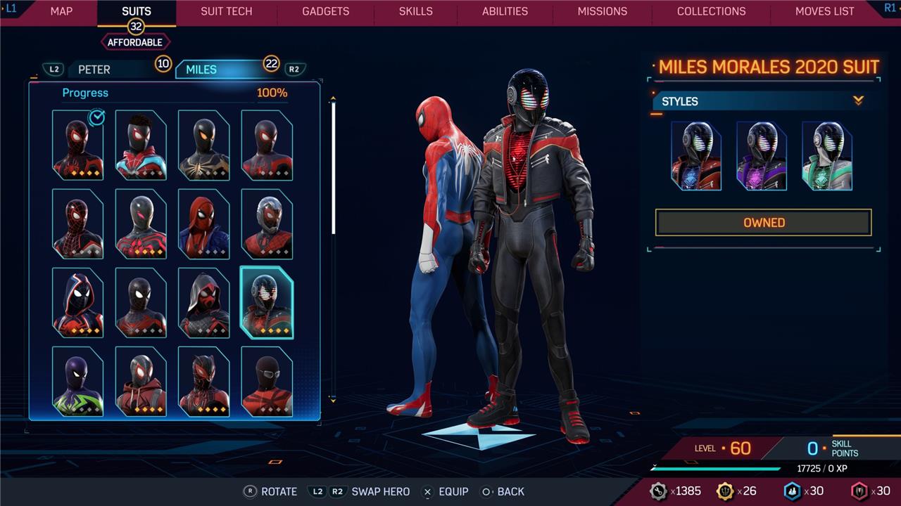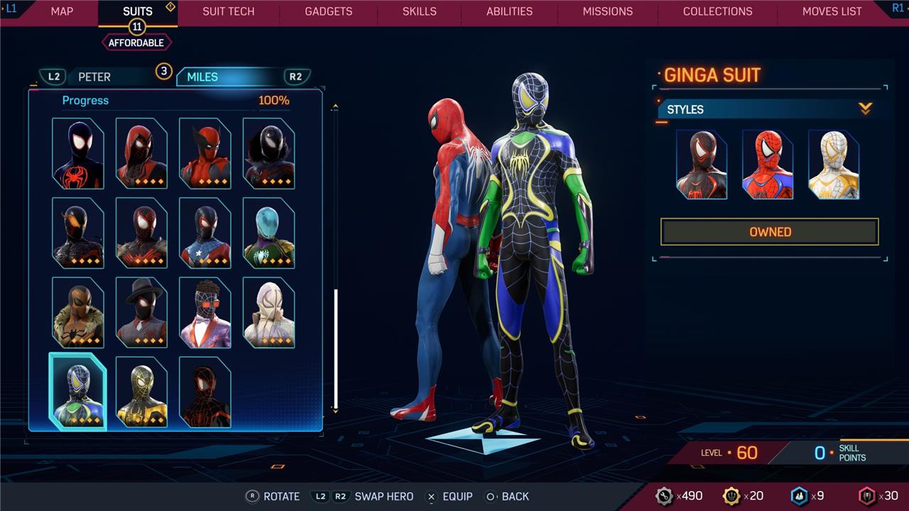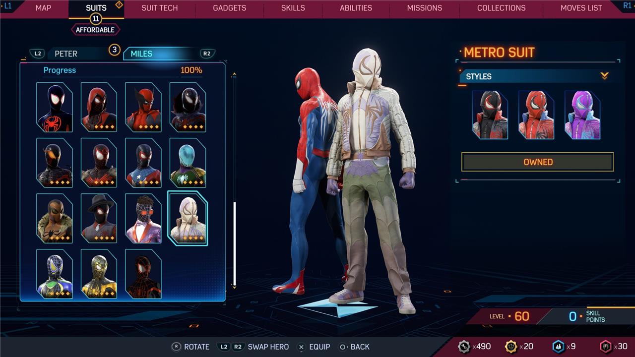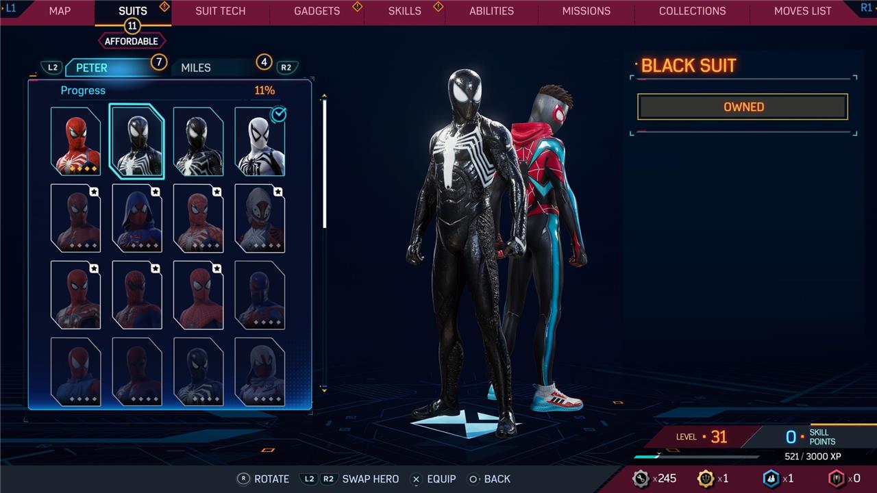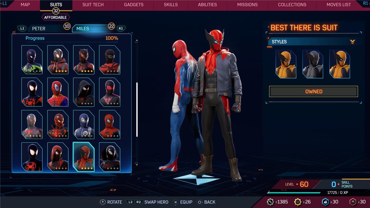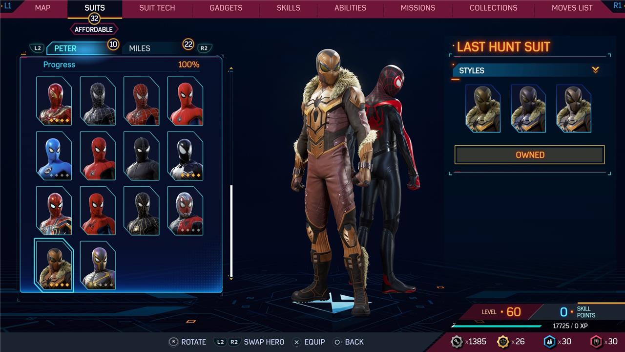 Marvel’s Spider-Man 2 offers an extensive collection of suits for both Peter Parker and Miles Morales, totaling 68 in the base game, with additional suits available through the Digital Deluxe Edition and DLC, bringing the total to 90. Players unlock most suits by progressing through the story, reaching certain character levels, or completing specific missions and side activities. Each suit often comes with multiple color variations called Styles, which require crafting using materials like Tech Parts, City Tokens, Rare Tech Parts, and Hero Tokens earned throughout gameplay. The Suits tab unlocks after a key story mission, allowing players to craft and customize their favorite outfits, enhancing both aesthetics and gameplay experience across PC and PlayStation platforms.