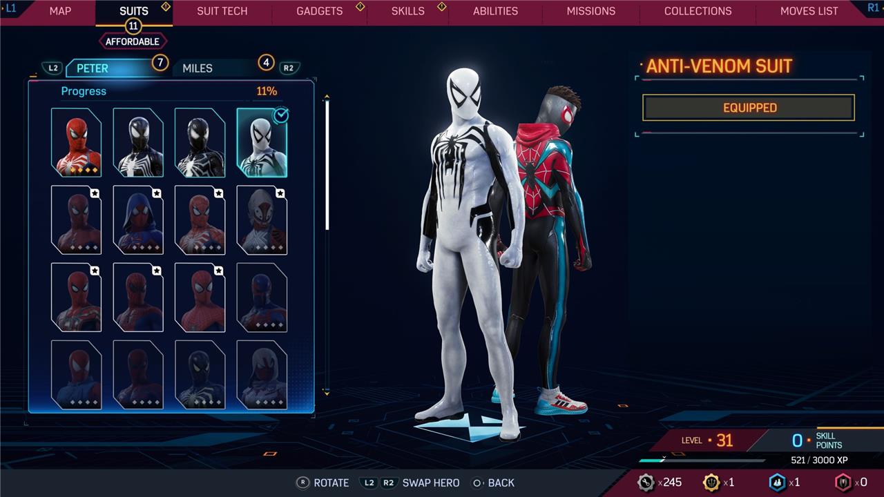 | Evolved Suit | Miles | Story Progress | N/A |
