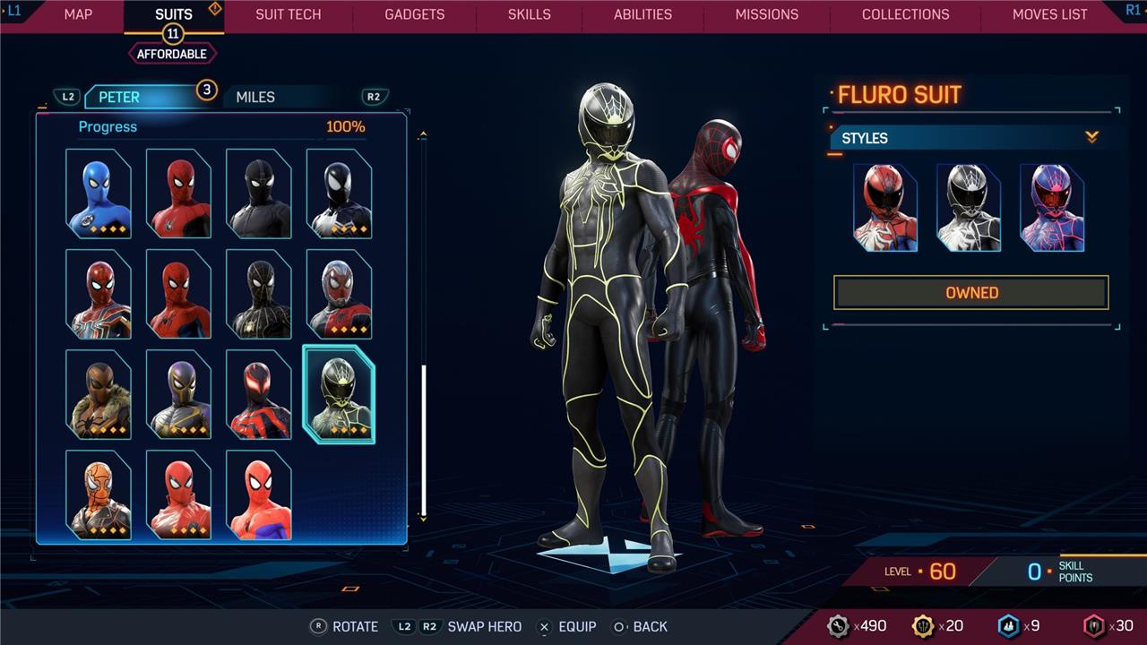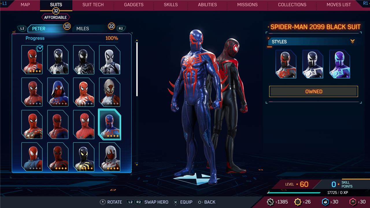Unlike in Spider-Man 2’s predecessor – 2018’s Spider-Man – suits in Spider-Man 2 are purely cosmetic. There are also suit styles, which offer different colorways of suits for a fee (of in-game currency). Most suits have these styles, though some (typically those based on movies) do not.