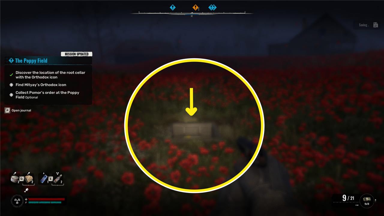 Drop down the hole and you’ll be safe from the poppies. Walk forward and pick up the Orthodox icon, which is the picture of a religious figure sitting on the shelf.
