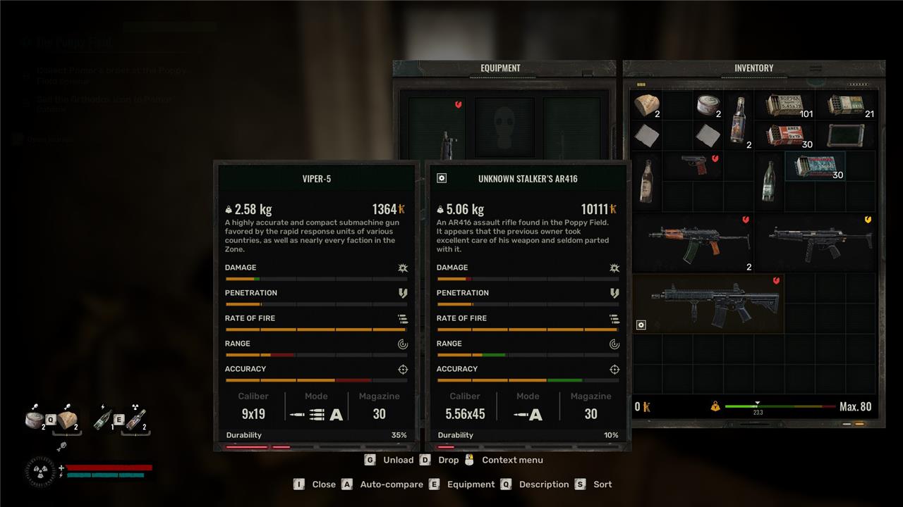 • If you give Pomor the Orthodox icon, he’ll hand over the Unknown Stalker’s AR416 (seen in the image above). This is a pretty decent rifle, with a high rate of fire, decent range, and good accuracy. However, he’ll give it to you at 10% durability, meaning it’s essentially useless until you devote a lot of resources to repairing it.