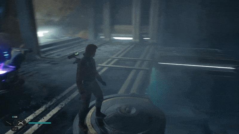 Ride the elevator up one level. You’ll see two more bridges – one on the left, flickering on and off, and one on the right – which you can toggle between using a Force Push lever. Focus on the left one first. Run onto it immediately as it starts to appear, then wall run to the far ledge.