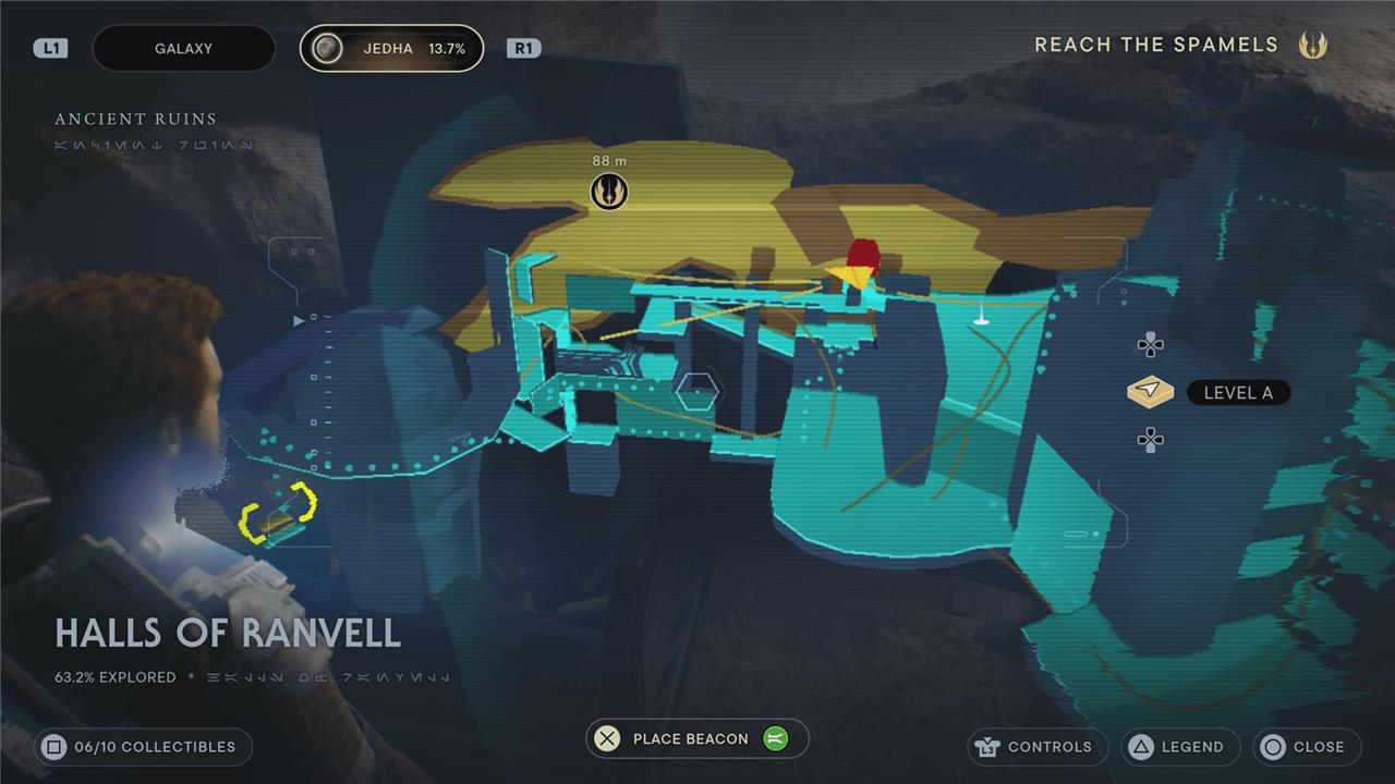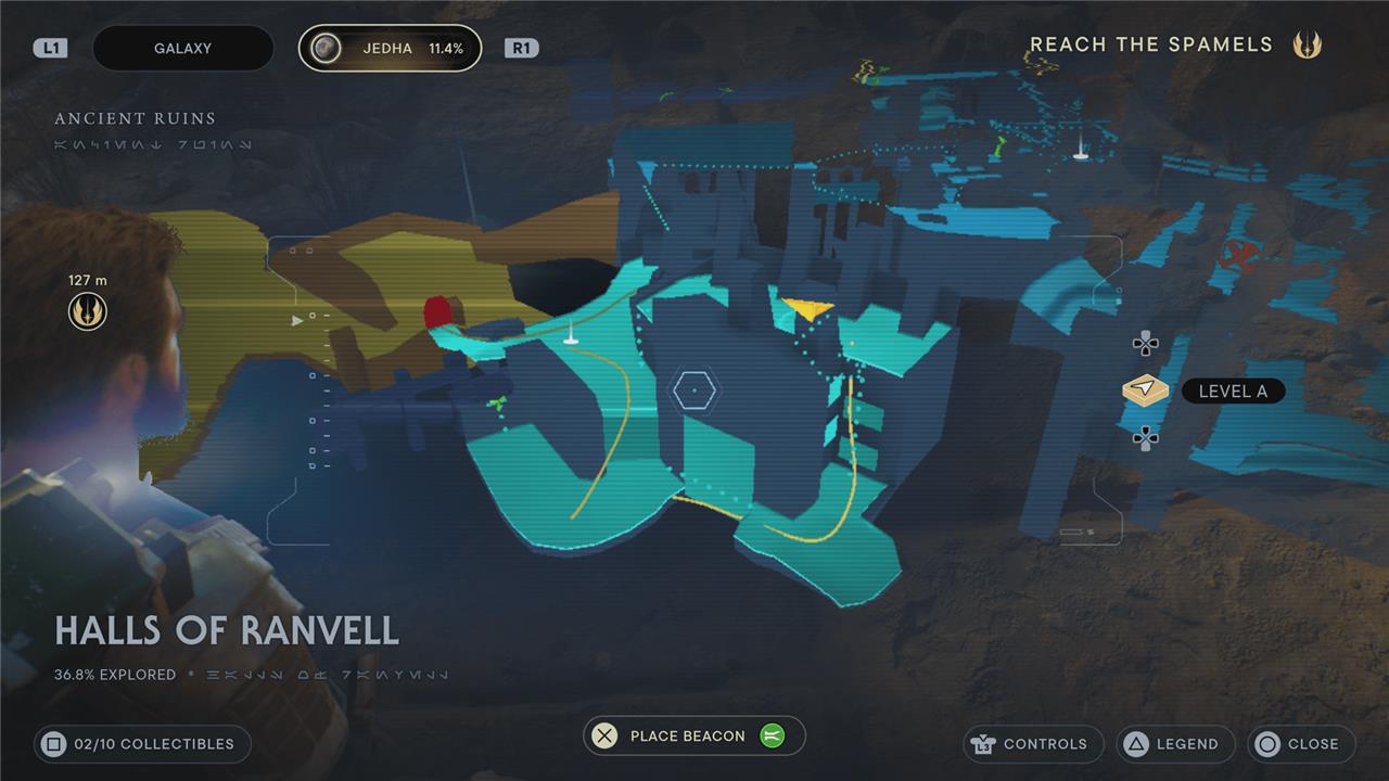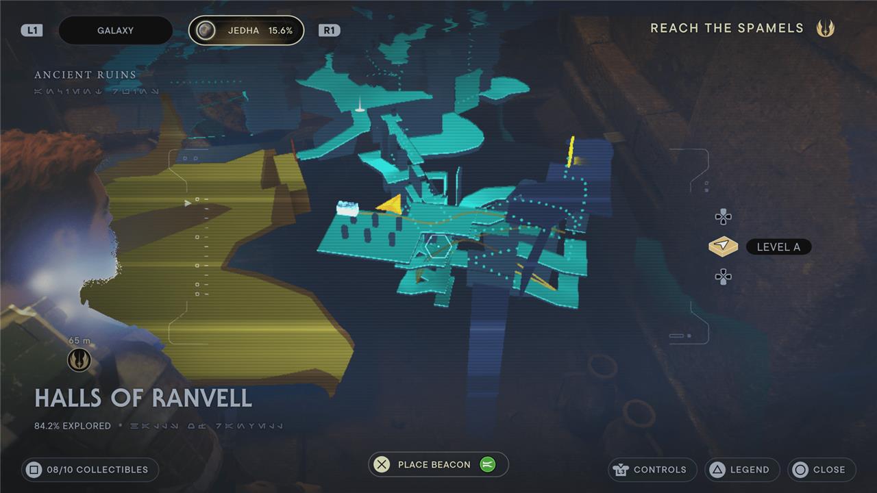There are five collectibles in the Halls of Ranvell region of Jedha: two chests, two essences, four databank entries, and two treasures.