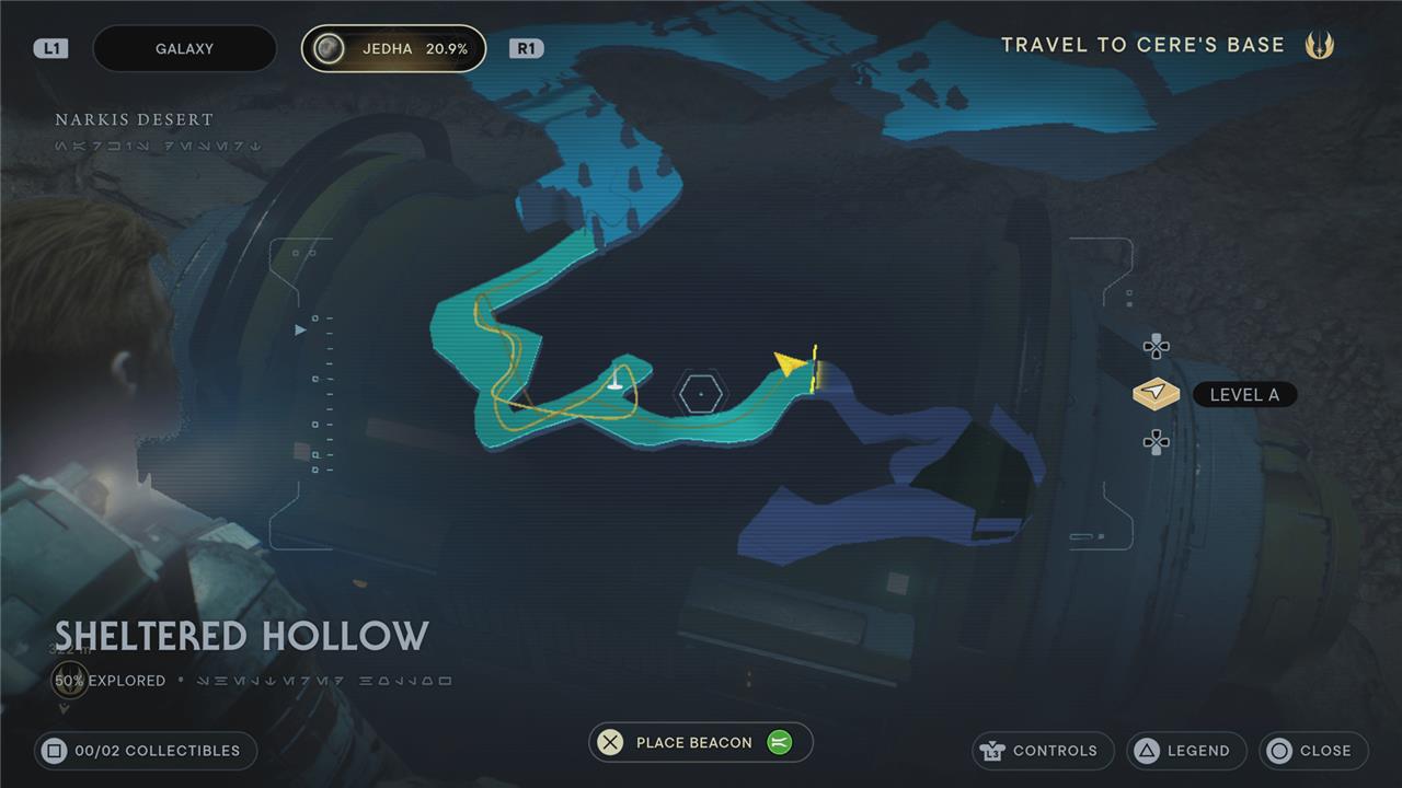 After your trip through the sandstorm in the Sandblasted Vestiges, you’ll spend the night in the Sheltered Hollow. When you wake up, there are two collectibles in the Sheltered Hollow region of Jedha: one chest, and one treasure.