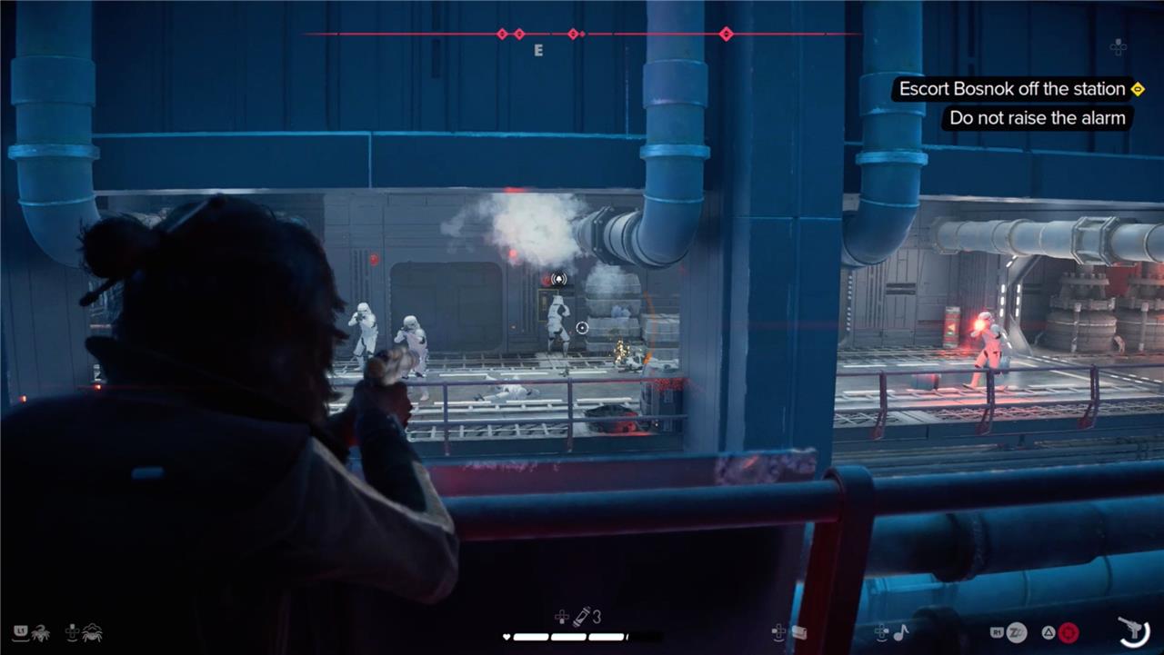 Take Down Enemies Quietly: When necessary, silently incapacitate officers and stormtroopers one by one rather than engaging in open combat, maintaining stealth throughout the mission.