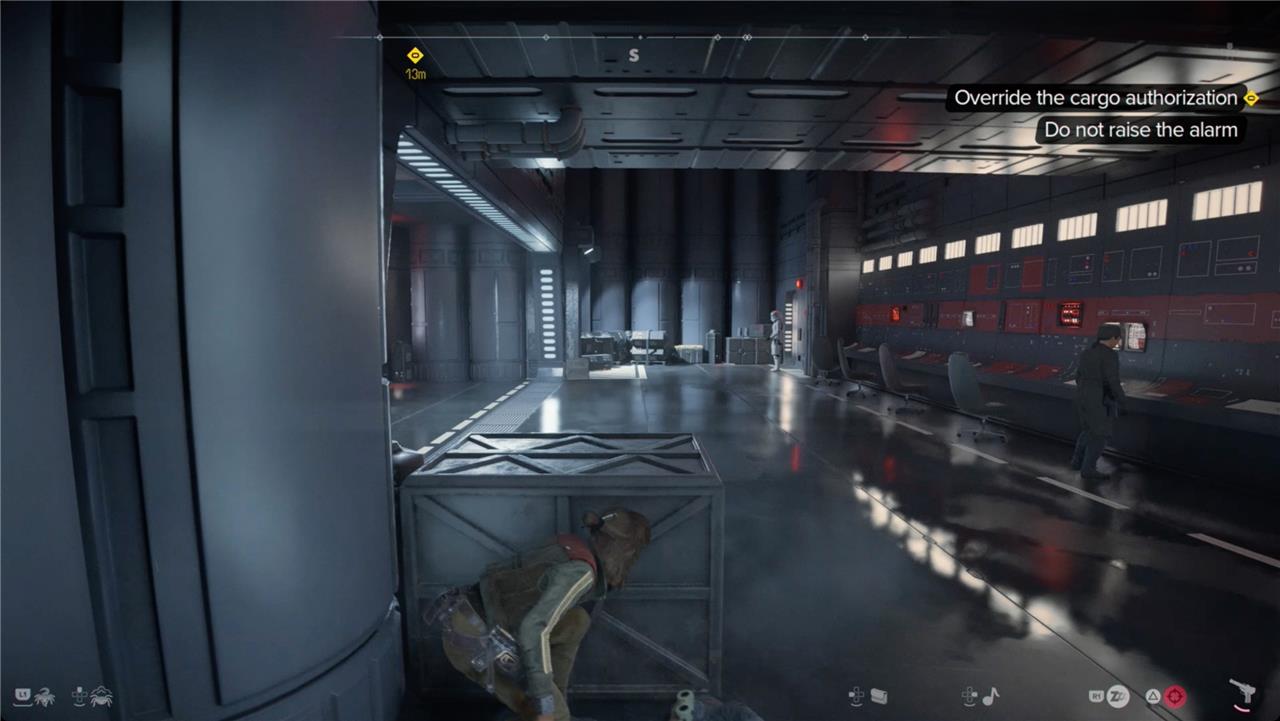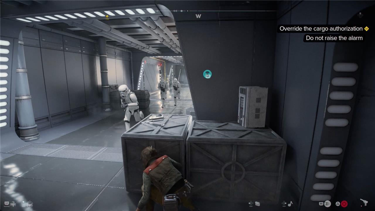 Head through the vent, up a ladder, and through yet another vent. When you hit the next computer terminal, you’ll get a new objective – to override the cargo authorization. Head to the right and up the ladder. At the top, duck behind the crates to wait for a stormtrooper patrol to pass.