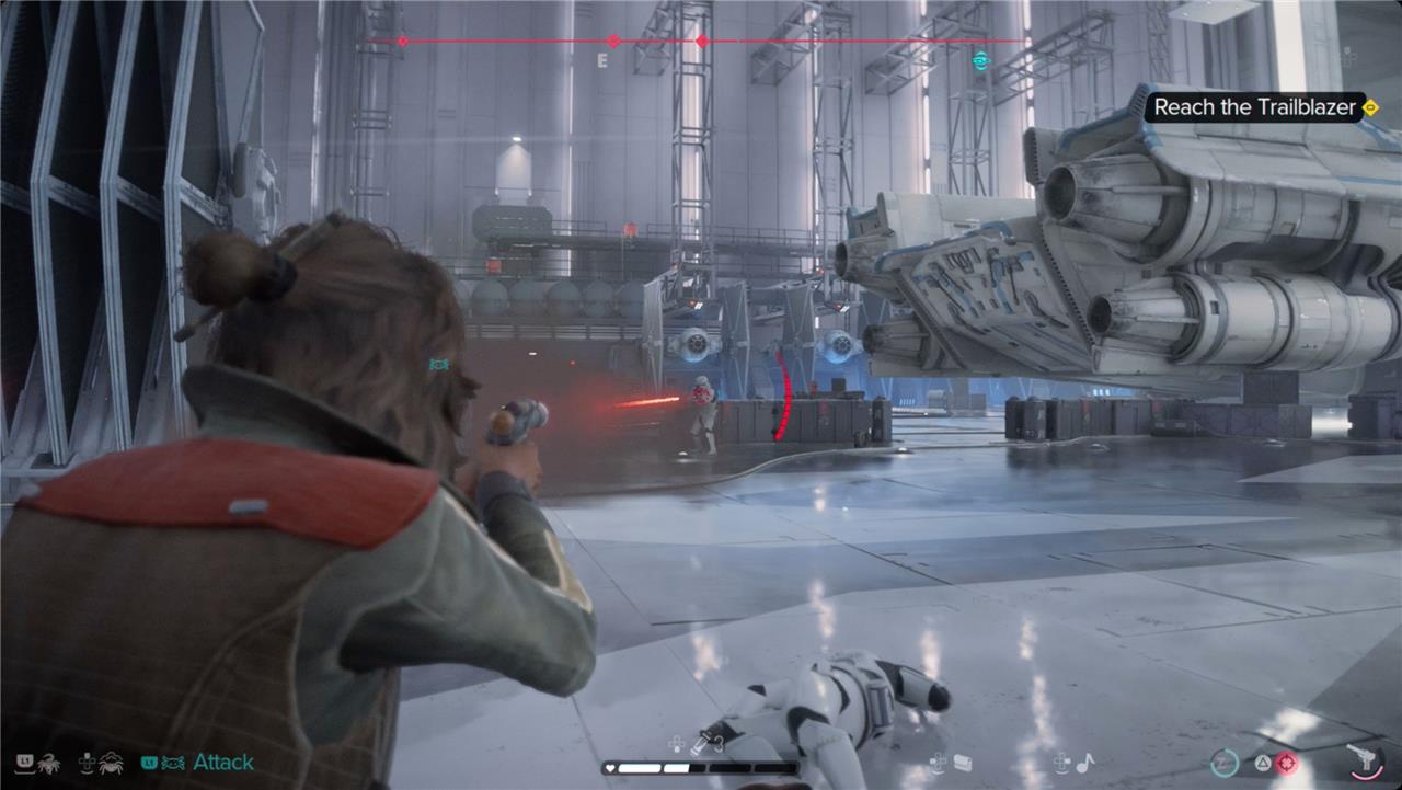 To reach the Trailblazer and hold out against the Empire in the False Flag mission of Star Wars Outlaws, after locating the data vault, you must prepare for a fierce firefight. Once you exit into the hangar bay, waves of stormtroopers will attack, so arm yourself with an E-11 Blaster Rifle and focus on taking down explosive canisters to manage the enemy onslaught. Watch out for stormtroopers equipped with rotary cannons and shield generators; use ion shots to disable their shields before finishing them off. Hold your ground until Waka opens the jammed cargo bay door on the Trailblazer. When the door is ready, board the ship quickly to trigger the escape sequence. After leaving the fueling station, engage or evade pursuing TIE fighters, then clear your wanted status at the Imperial comms to complete the mission successfully.