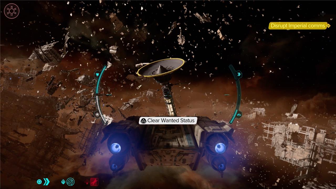 After securing the data vault, your next objective is to escape the Imperial fueling station and reach the debris field. Exit the vault area using the designated route, then make your way back to the Trailblazer ship. Once aboard, fly out of the station while evading TIE fighter pursuers in a brief space combat sequence. Head directly towards the debris field, where you can locate a small satellite to clear your wanted status by interacting with it. Successfully doing so will allow you to evade the Imperial forces and continue your mission to Mirogana.