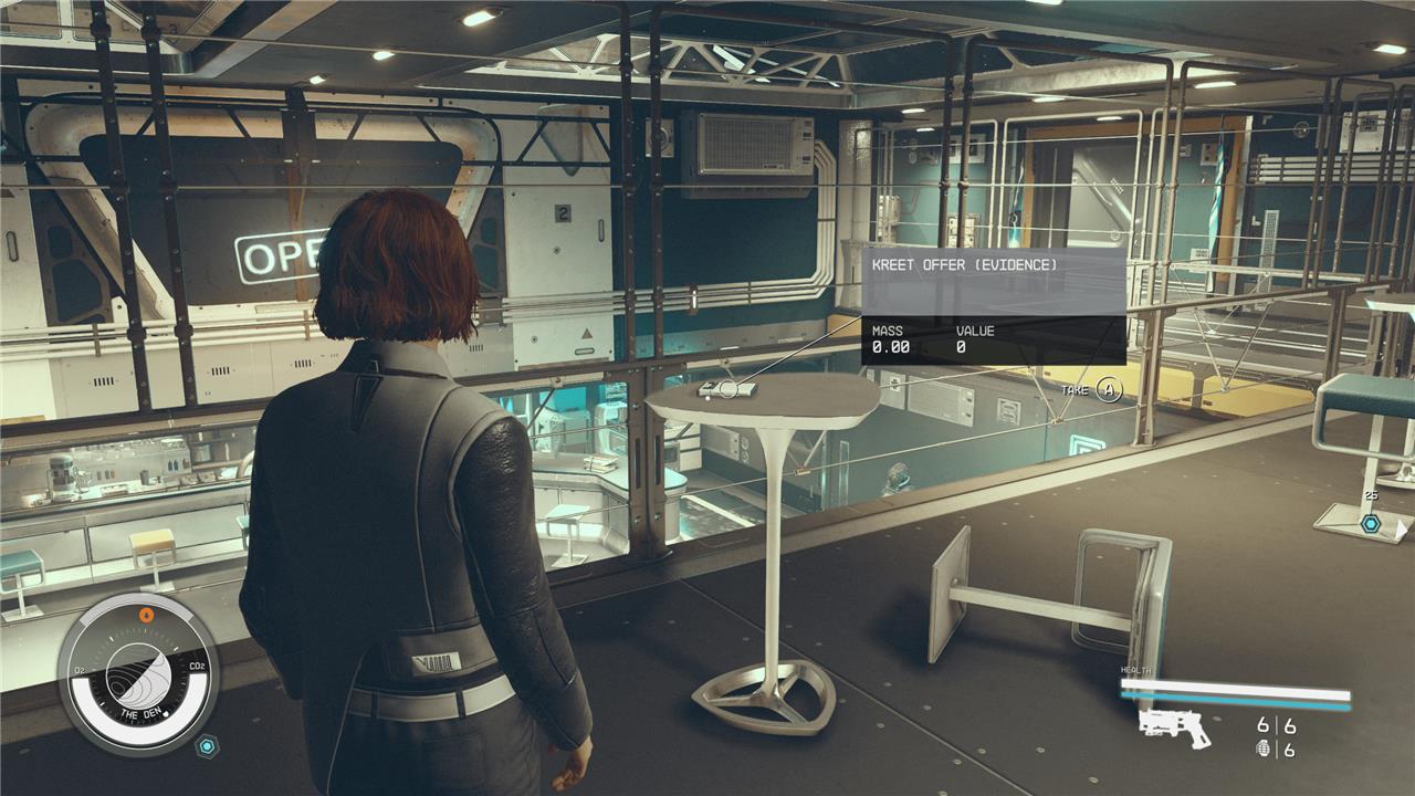 If, like me, you already find yourself frequenting The Den to sell your wares to the Trade Authority, you’ll be pleased to hear there is some evidence you can grab next time you swing by. Once you exit your ship, move directly forward to the tables overlooking the bar. On the central table, you can pick up the Kreet Offer (Evidence) text log.