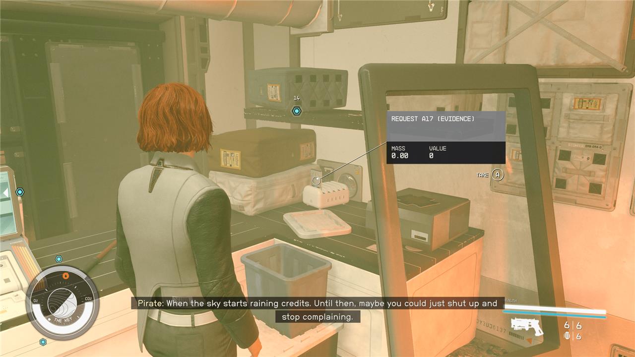 The “Request A17” evidence in Starfield’s “Burden of Proof” quest is located on The Key, a station orbiting Subrov in the Kryx system. You can find this piece of evidence in the Ship Services room, on a desk next to Jasmine Durand. It is inside a white object positioned above a grey tub, to the right as you enter the room from the docking area. Collecting this evidence contributes to the overall quest progress and helps in building the case against the Crimson Fleet for Lieutenant Toft aboard the UC Vigilance.