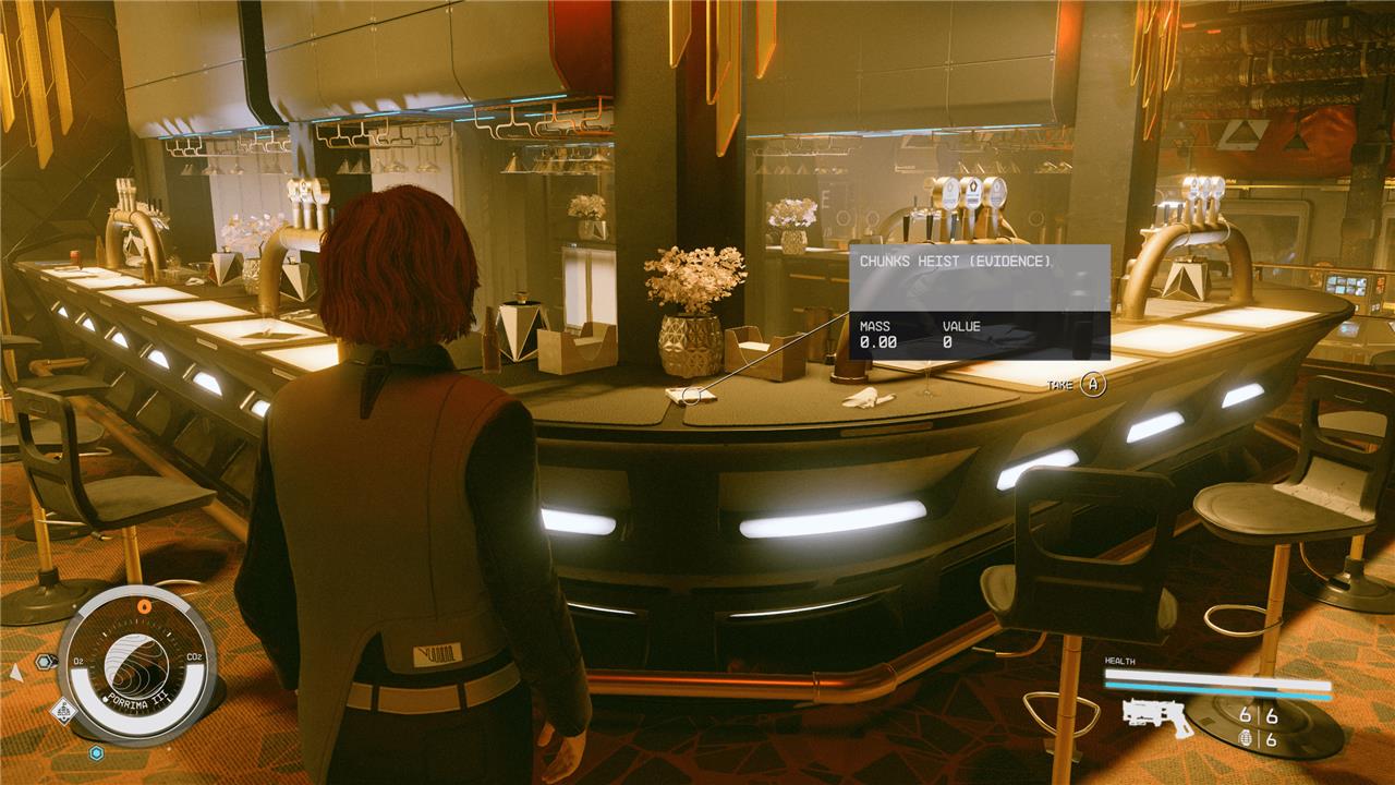 For this piece of evidence you’ll need to make your way to Porrima III and search across the planet for a landing location called the Red Mile. Exiting your ship, it will be the only building in sight so head in the front door. Veer left into the main gambling area, and on the left corner of the bar, you’ll find Chunks Heist (Evidence).
