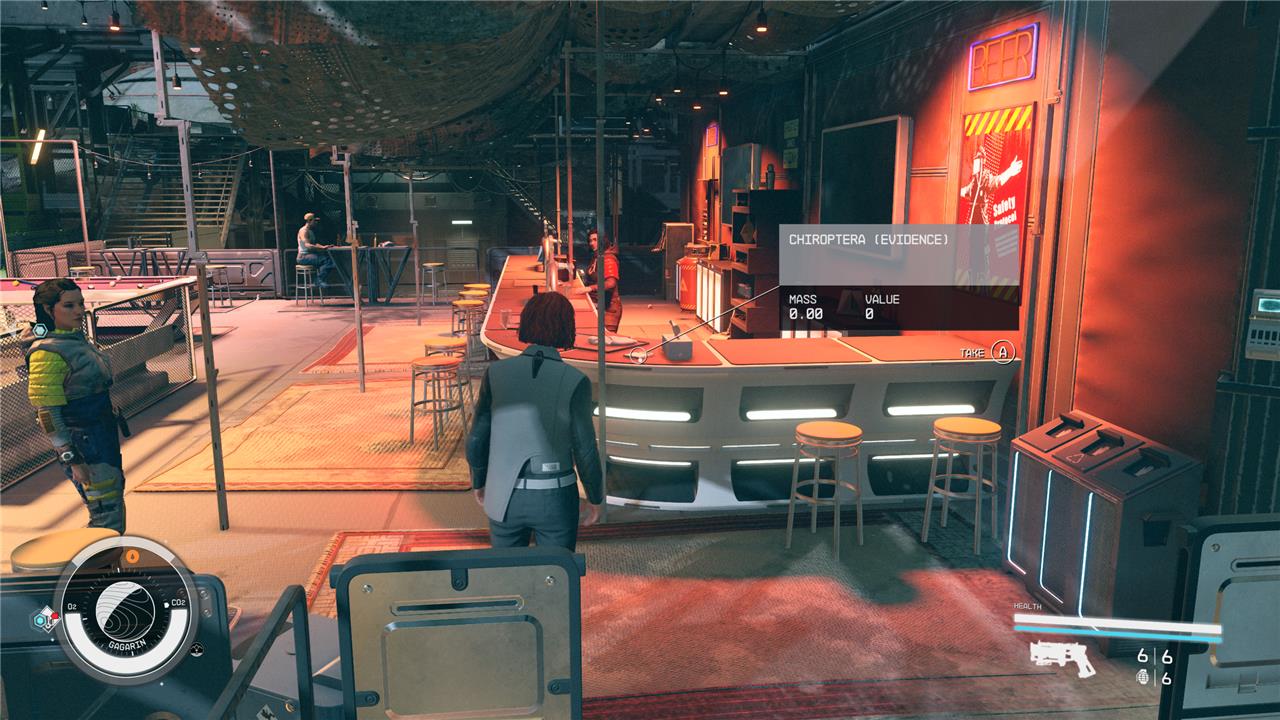 Our next piece of evidence is conveniently located in the Alpha Centauri system, a stone’s throw from New Atlantis. Land at the Gagargin’s Landing marker on the planet Gagarin and move towards the built-up complex. Keep going straight until you find some stairs and go down them. Walk straight past the Centauri Mills building to a red-hued bar run by a character named Lizzy Ajello. On the right corner of the bar, you can pick up the Chiroptera (Evidence) audio log.