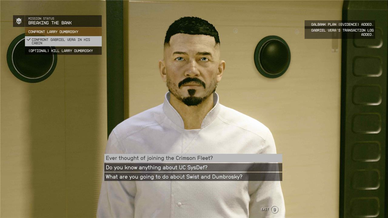 It’s important here to avoid thinking with your gun and talk things through until he offers you information for 2,500 credits. There is no option to Persuade, so stomach the cost, and the Galbank Plan (Evidence) will be added to your inventory.