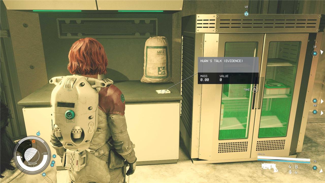 Huan’s Talk evidence can be found in the Alpha Centauri system on the planet Jemison, specifically in The Well district of New Atlantis. To locate it, players need to enter Kay’s House restaurant, proceed through to the kitchen, and find the evidence on a bench beside the beer fridge. This piece of evidence is tied to the Crimson Fleet faction quest “The Best There Is” and is not missable, making it an essential part of the Burden of Proof questline where players gather incriminating information against the Crimson Fleet.