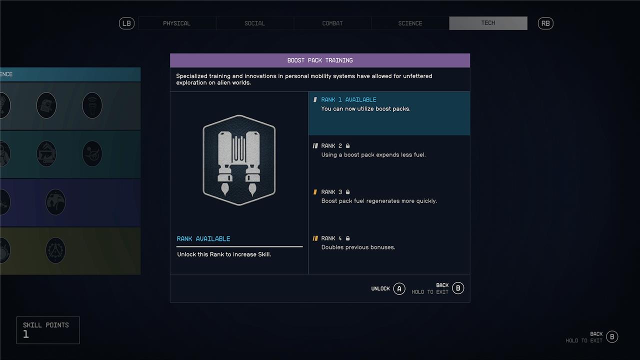 You can’t use a boost pack – that’s Starfield-speak for “jetpack” – without acquiring the Boost Pack Training skill. At first, it’s little more than a glorified double-jump, but if you’re on a boring old 1g planet, and you time it right before hitting the ground after a long fall, you’ll offset fall damage. Further investments in the skill turn your boostpack into, well, not quite a full-on jetpack, but at least something closer to what we were promised.