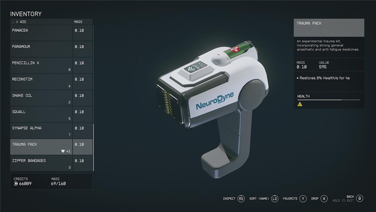 It’s a hostile universe out there full of pirates and Spacers and automated security turrets and hungry alien monsters (not to mention the hazards of high gravity). You’re going to take damage. Eating something will get you a few point of health here and there, but real healing comes from med packs, trauma packs, and emergency kits.
