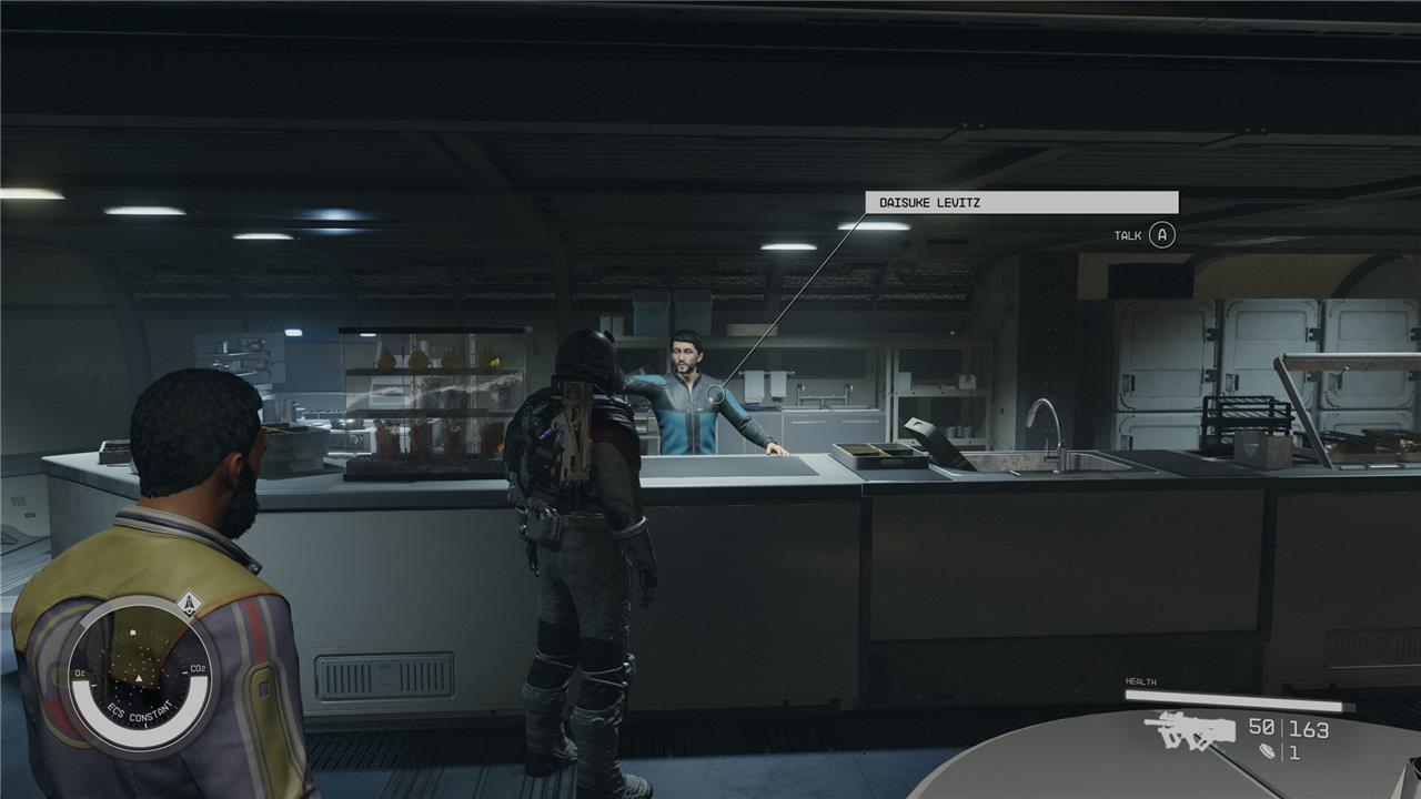 If you’re successful, Brackenridge will tell you to speak with Daisuke Levits. To find him, go down the hall past the Med Bay, turn right, and go down the steps toward the mess hall. He’ll give you 50 iron, 12 sealant, 15 fiber, and 6 lithium.