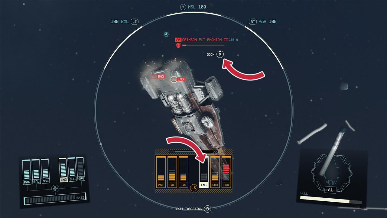 When you’re fighting an enemy ship – basically any ship whose marker is red on your HUD, which either means they started out aggressive, or you’ve (accidentally) shot them – and want to steal it for yourself, you’ll first need to take out its engines. Once your weapons have a solid lock, hit the X button, use the left stick to highlight the ENG option and fire away. Ideally, you’ll do this relatively early in the fight – damaging the engines also damages the hull, so if you reduce the hull to zero, the ship will explode.