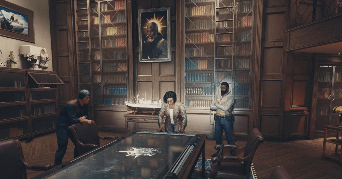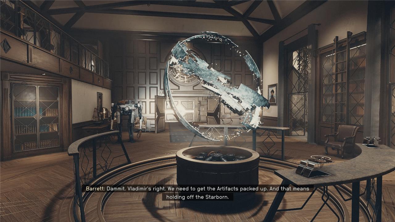 When you place the artifact, you’ll notice that the entire Constellation crew is gathered around the digital table in the back of the library. They’re all talking to Vladimir, who is up in The Eye and describing an attack that they just endured. He sounds injured, and if you pry, he’ll tell you that another of your companions is injured.