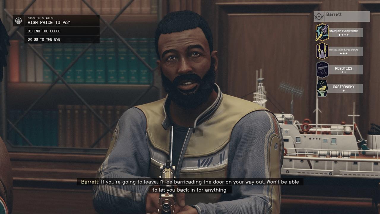 Choosing to defend the Lodge in the “High Price to Pay” quest in Starfield means you stay to protect your companions there from the Hunter’s attack. During this intense defense, you will confront the Hunter on the second floor, using your strongest weapons to fend him off while your allies escape through a secret passage in the basement. After the fight, you must make a quick escape through the sewers and eventually reach your ship. However, this choice comes with a heavy cost: the companion closest to you at the Eye will be killed, making this decision emotionally challenging as it permanently affects your favorite crew members. Despite the loss, defending the Lodge allows you to keep your closest companions there safe and continue the questline with a significant reward and story progression.